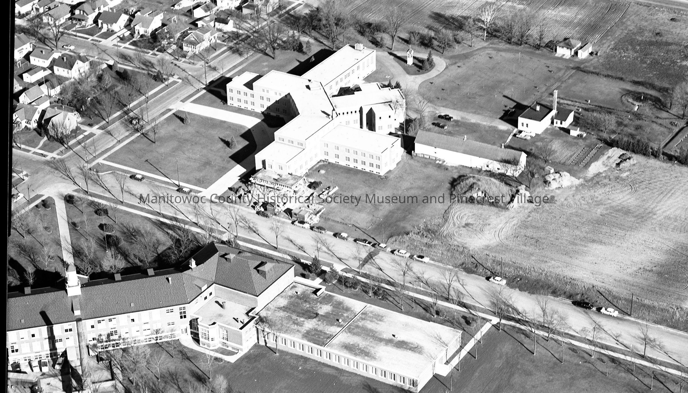 Aerial of St Mary Home for the aged, 2005 Division Street and below is Washington Junior High School, 2101 Division. Street running left to right is South 21st Street. Photograph taken on November 17th, 1958.Made/Created