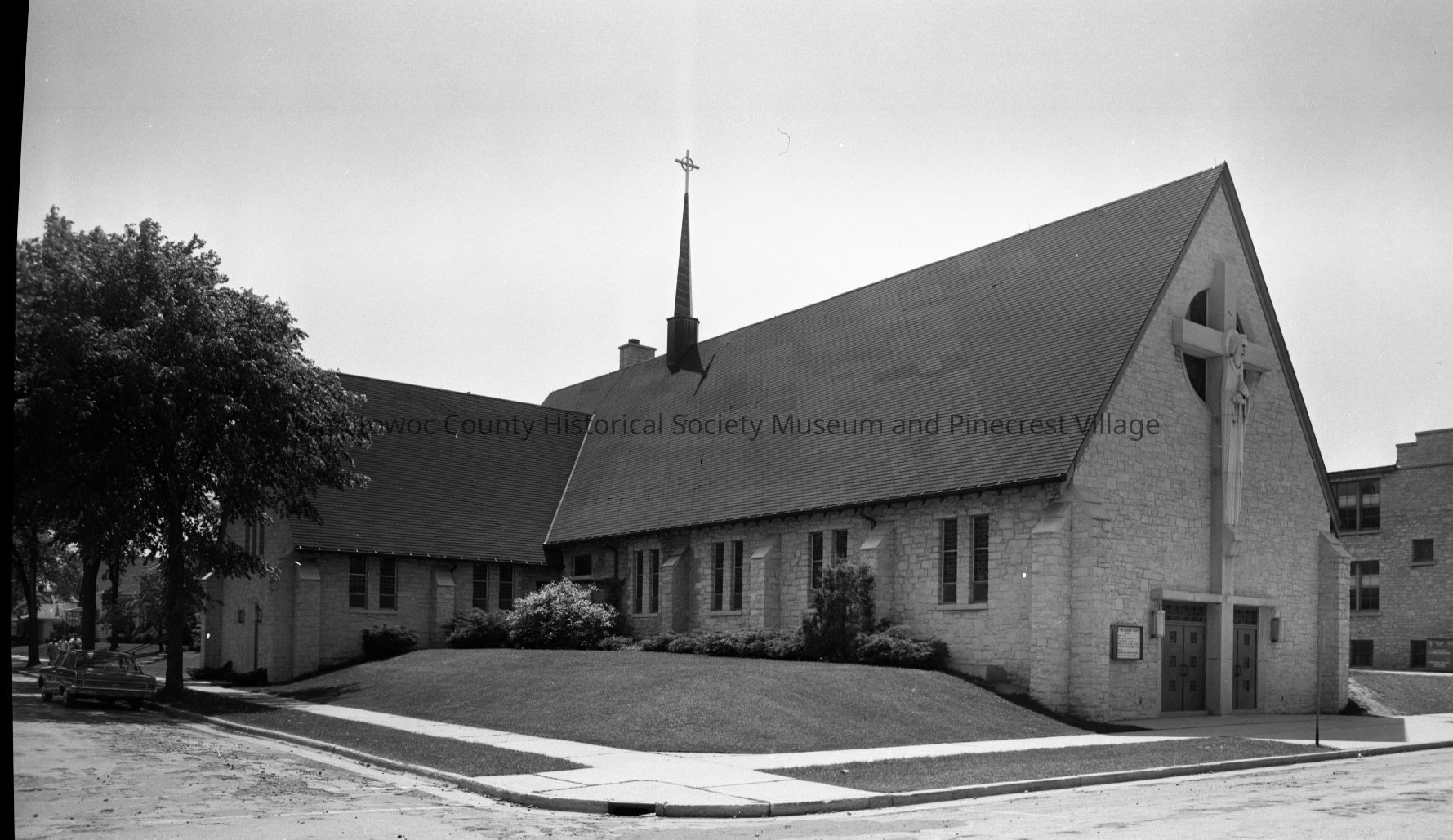 St Paul Catholic church, 2401 Wollmer Street Manitowoc; looking southwest from corner of South 24th & Wollmer Street; school at right. Circa 1960.Made/Created