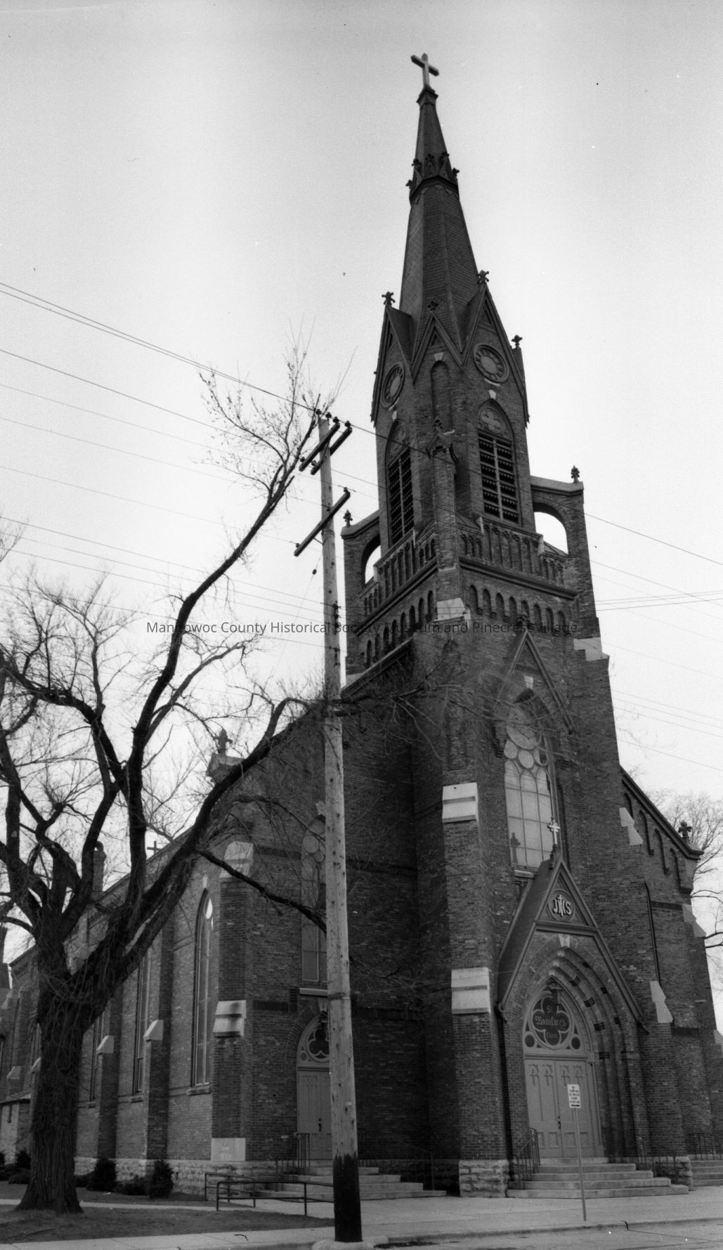 St. Boniface Catholic church, 1001 Marshall Street Manitowoc; priest home at left, 1110 South 10 Street. Circa 1958.Made/Created