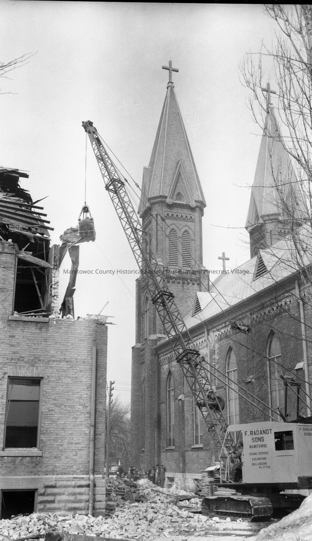 School - St. Mary Catholic, 2111 Marshall Street Manitowoc; old school coming down, church at right. Photograph taken on March 25th, 1959.Made/Created