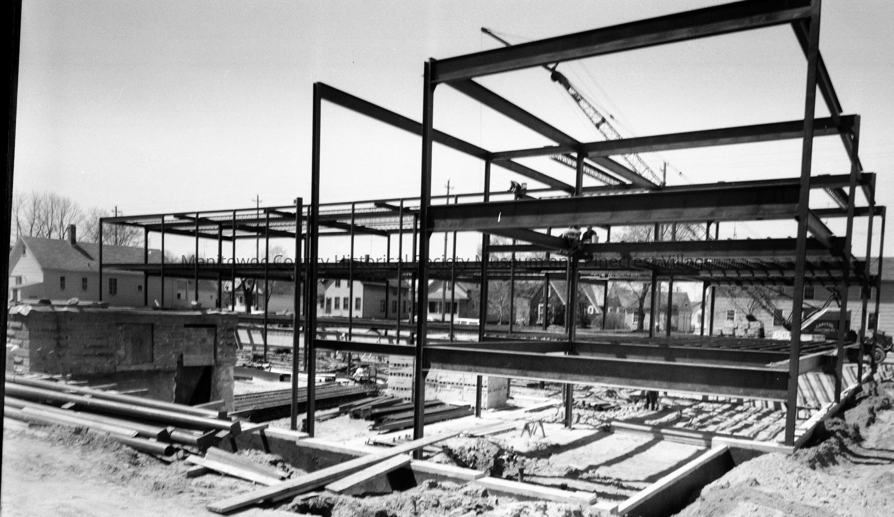 School - St. Mary Catholic, 2111 Marshall Street Manitowoc; steel frame-wrok on new school. Photograph taken in April 1959.Made/Created