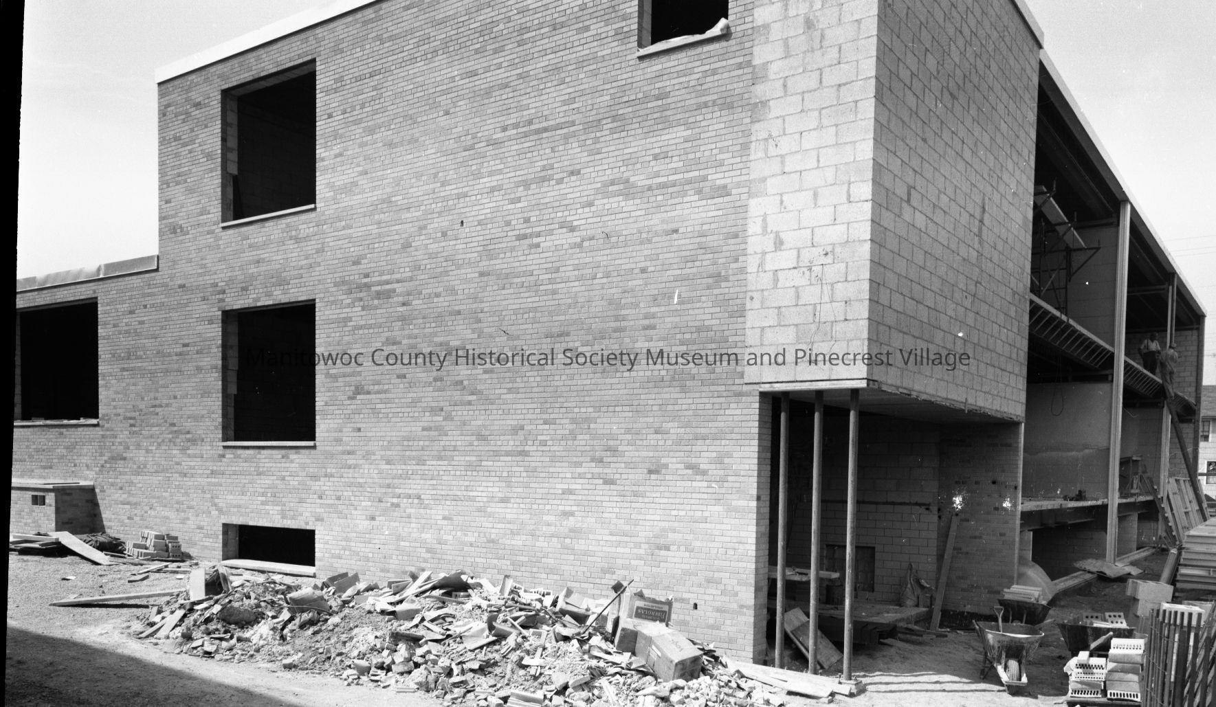 School - St. Mary Catholic, 2111 Marshall Street Manitowoc; work on front of new school; building at right is Katsy & Fritzie's Bar, 2201 Marshall Street. Photograph taken in May 1959.Made/Created