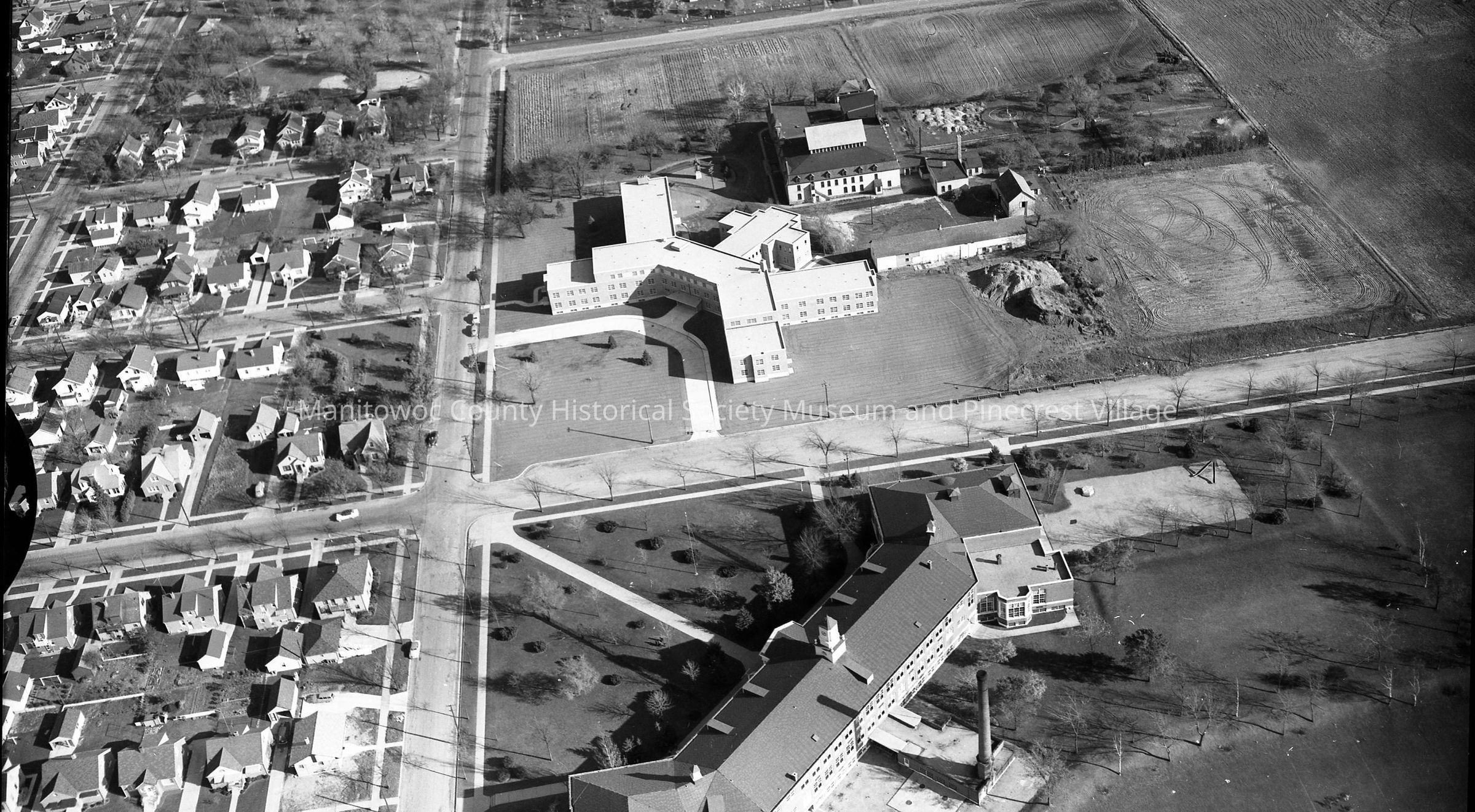 Aerial: St. Mary's Home, South 21st & Division Street Manitowoc. Washington Junior High School at bottom. Division Street at left, South 21st Street between St. Mary's & Wsahington Jr. High. South 18th Street and St. Mary's Cemetery center near top and Green Street upper right.