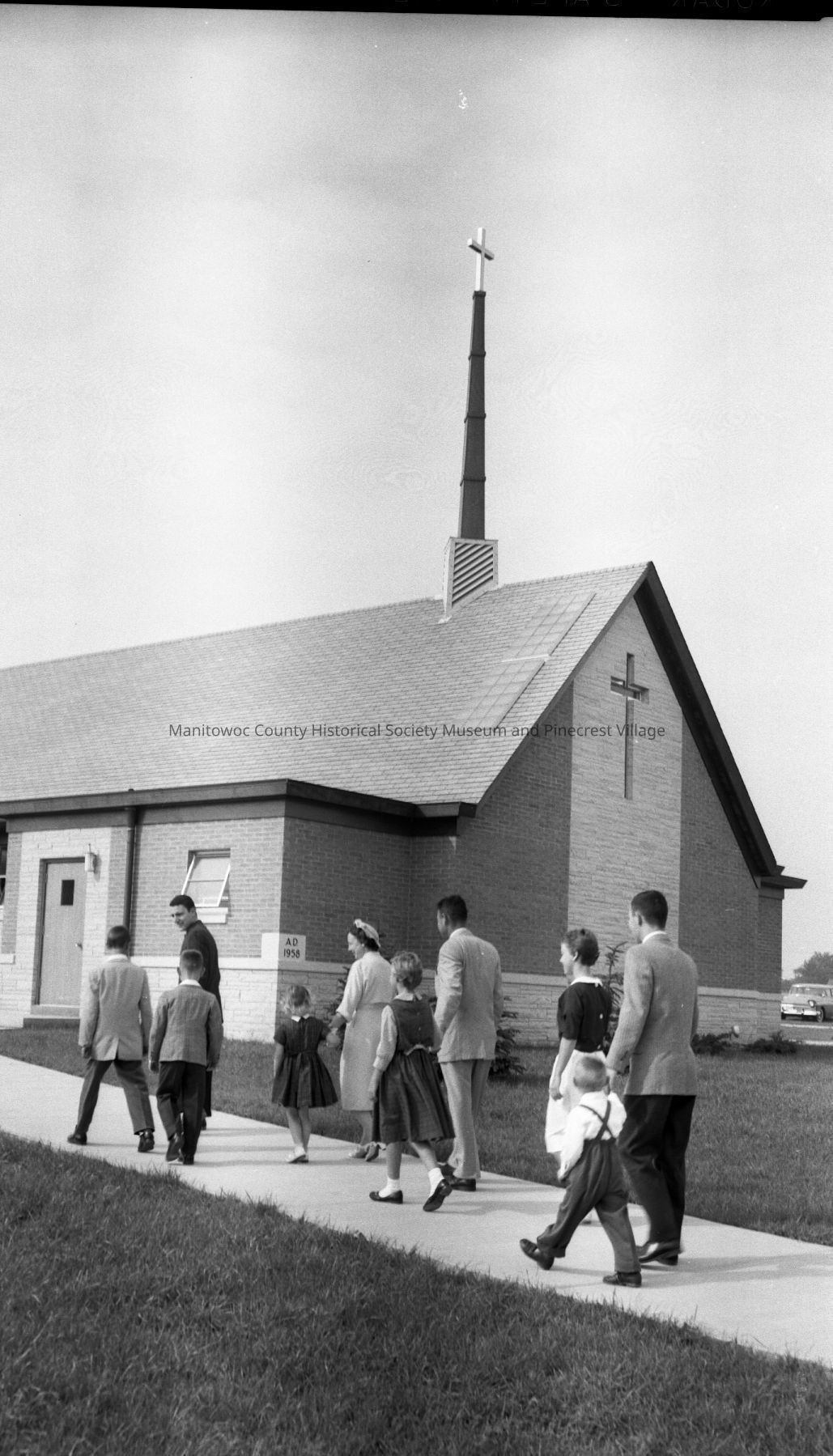 St. Paul Methodist Church, 411 Reed Ave Manitowoc; people entering church. Crica 1958.
