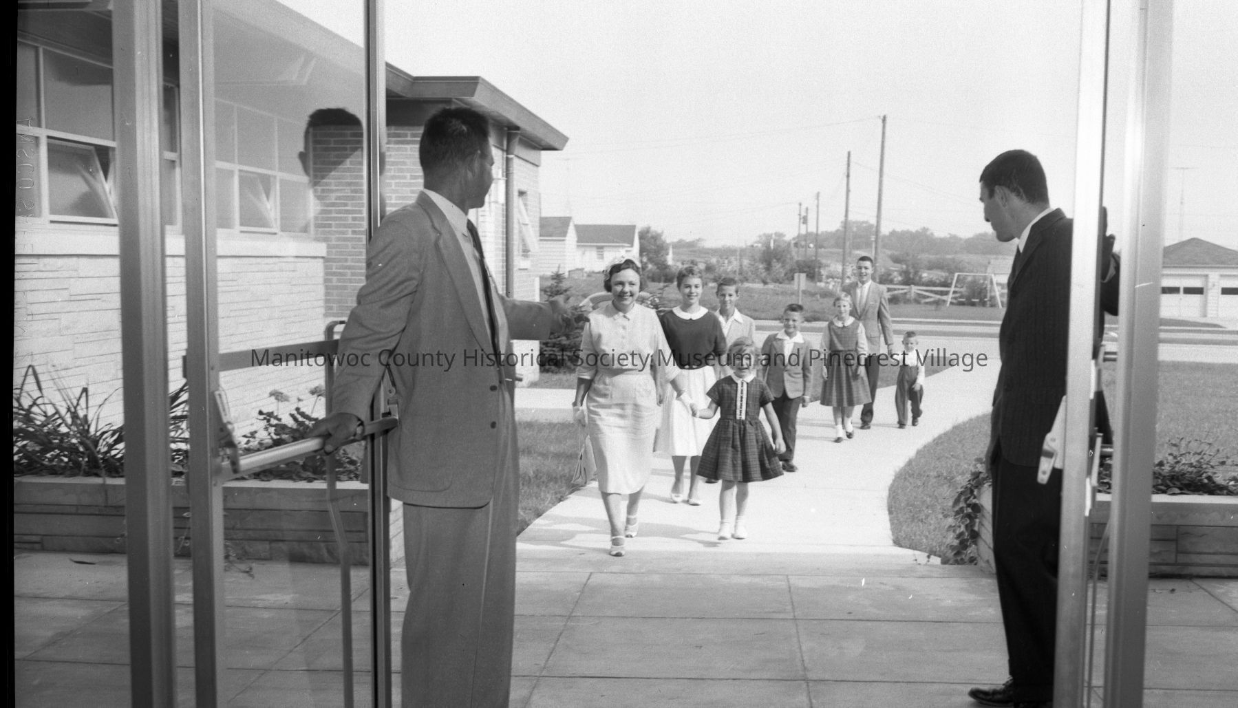 St. Paul Methodist Church, 411 Reed Ave Manitowoc; ushers holding doors. Cicar 1958.