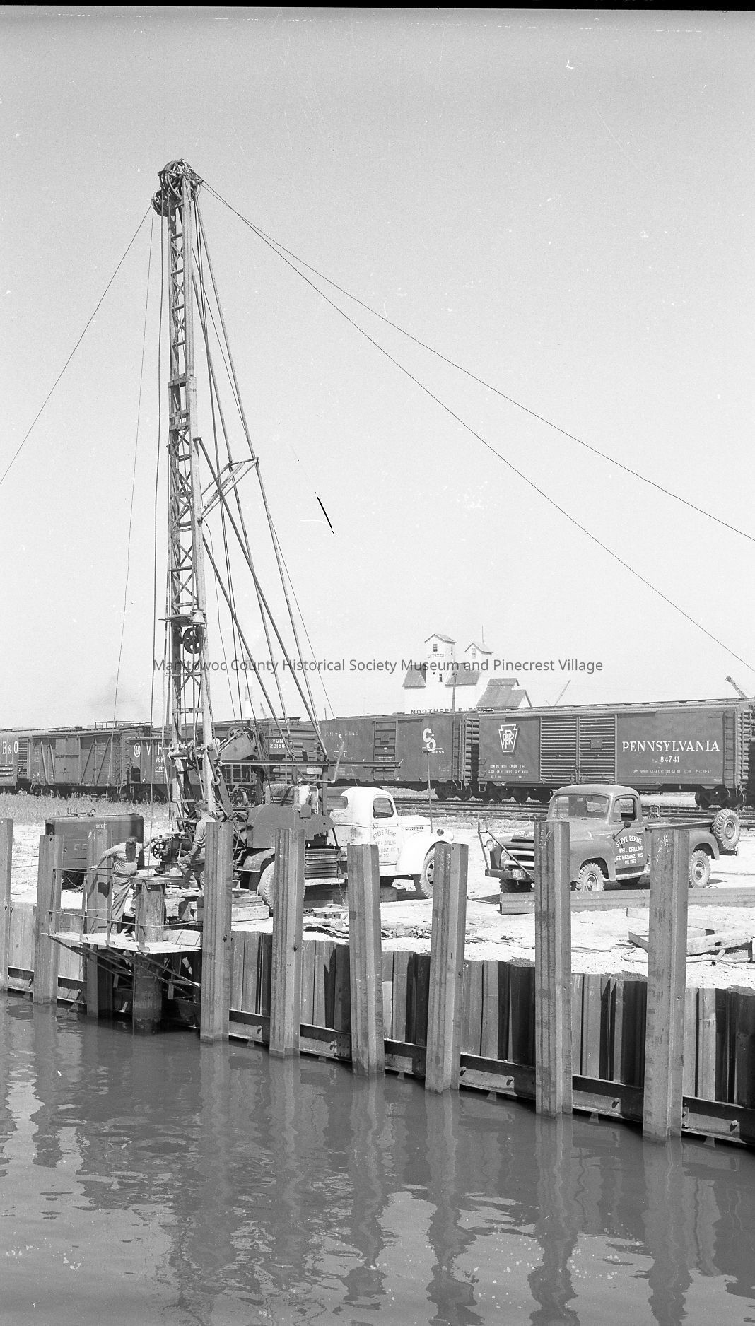 Steve Rehme, well driller from St. Nazianz, doing river wall work near Soo Line carferry slip. In background is Northern Elevator, 1101 Buffalo Street.