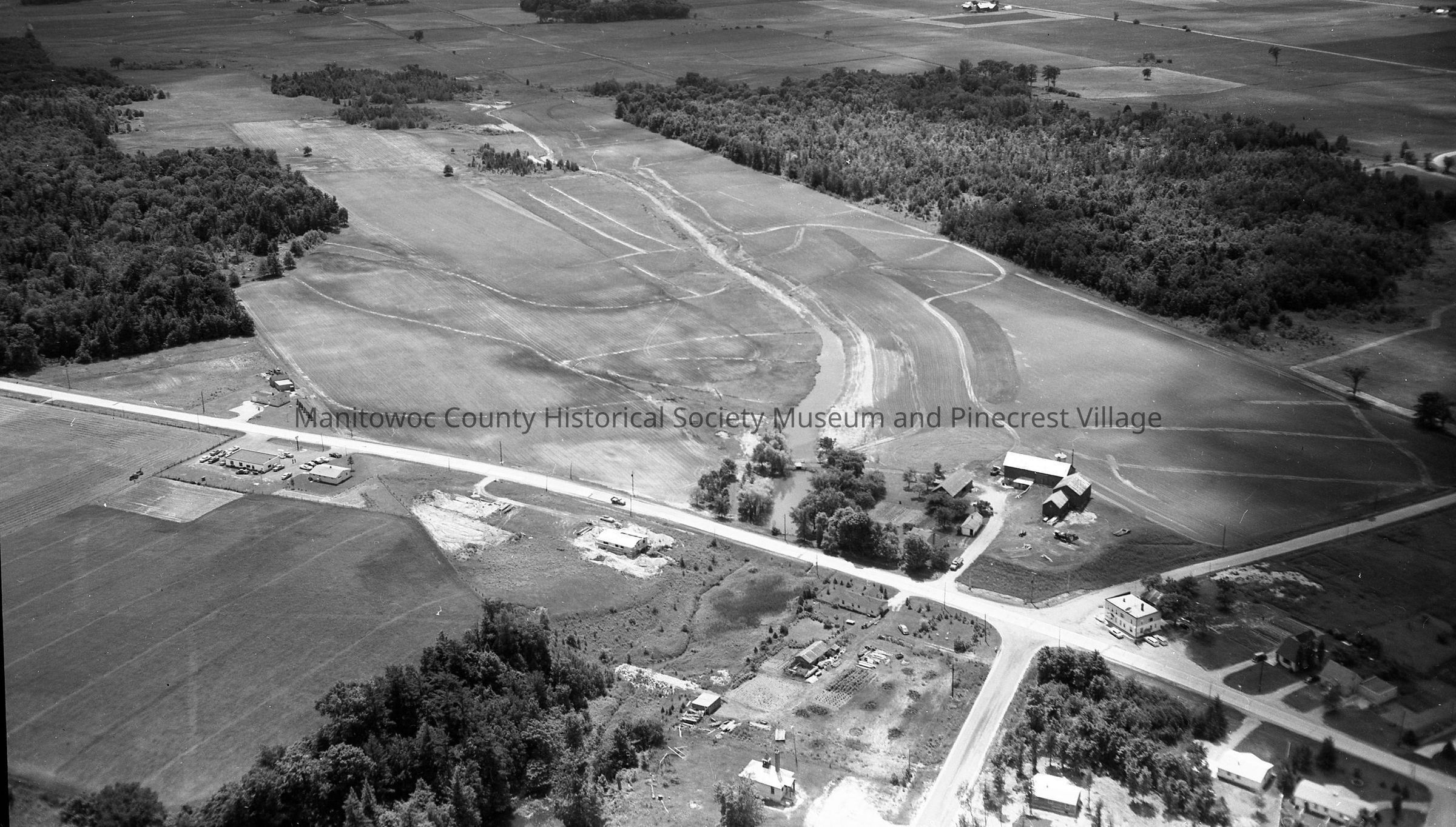 Aerial: Stiener's Corners, Highway 147 and Stiener Road. At bottom center on Stiener Road is Mishicot #5 School Pine Grove and at intersection is the Round-Up Bar.