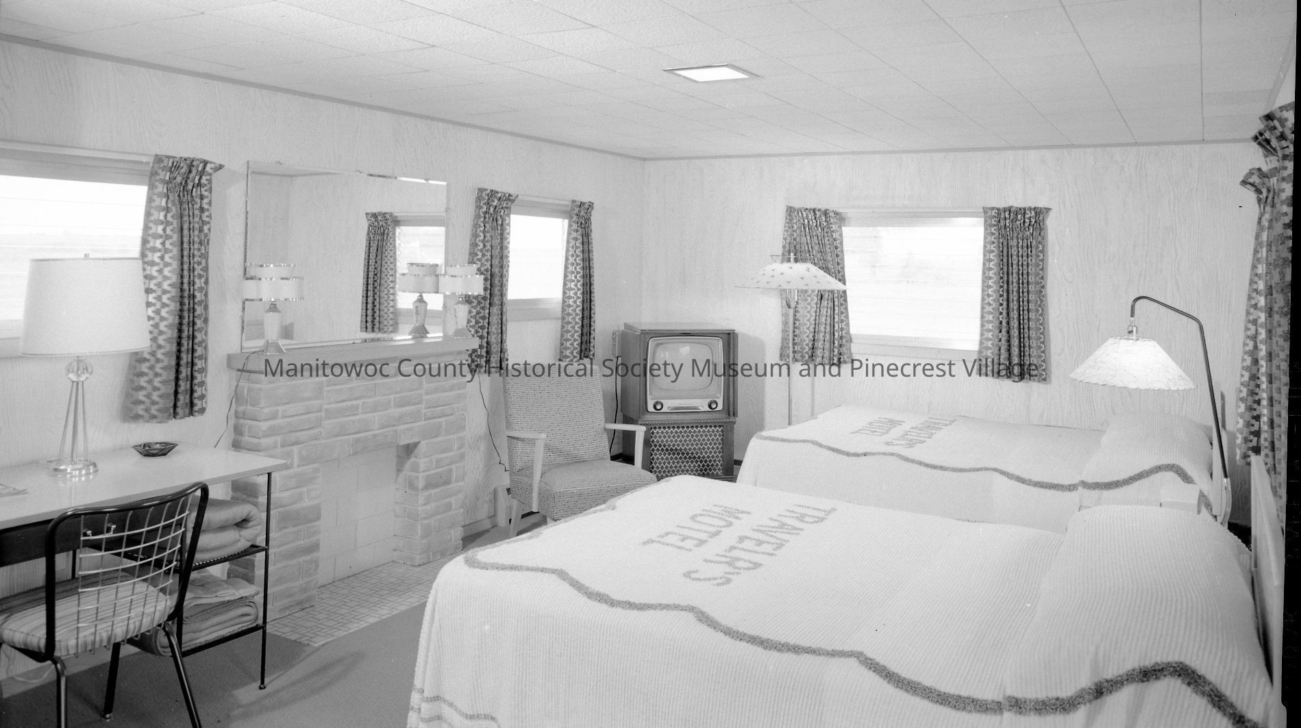 Interior of room at Stock's Travelers Motel, highwat 141 south of Manitowoc. Photograph taken on August 24th, 1958.Made/Created
