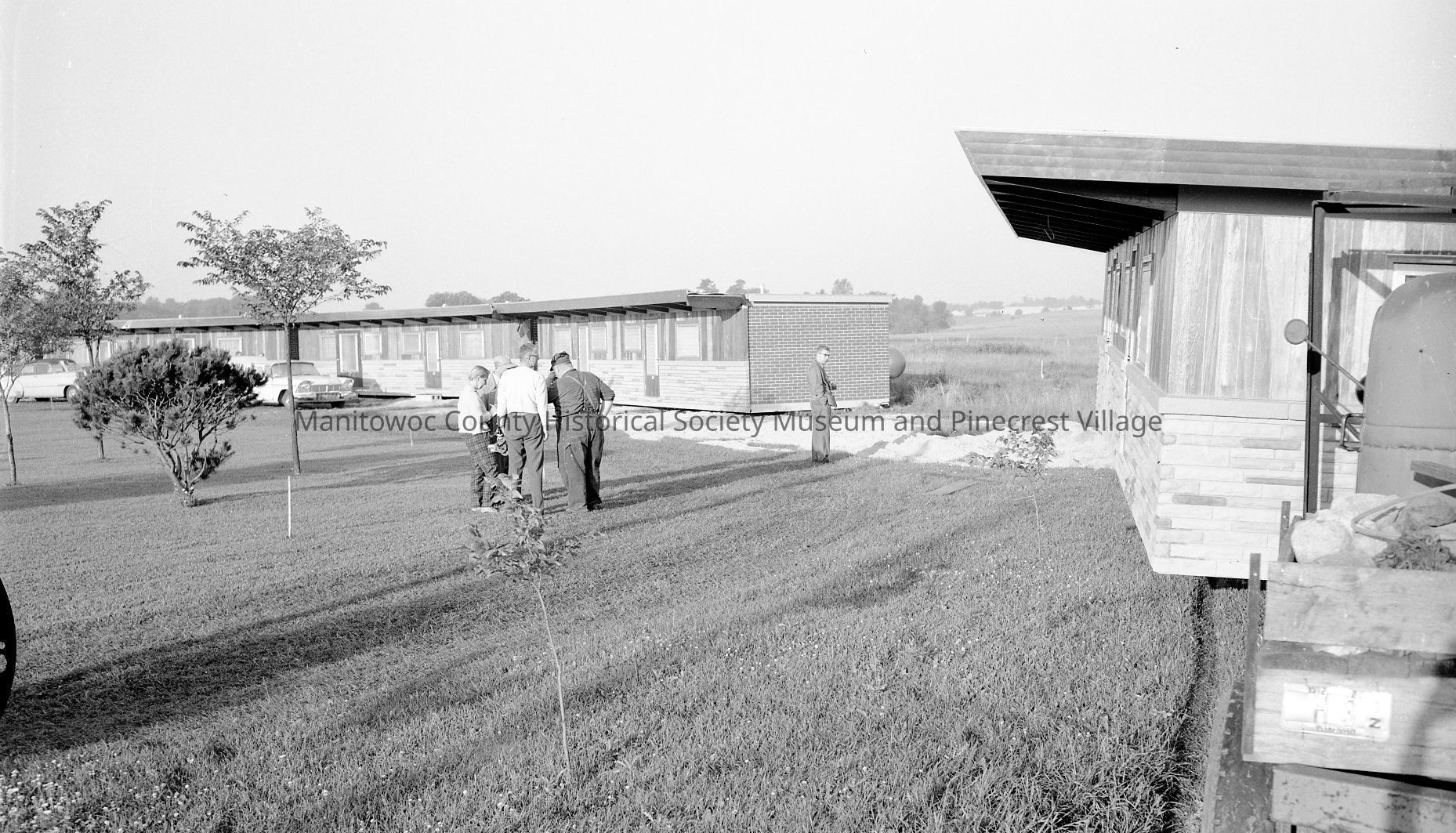 Moving modular section of Stock's Travelers Motel into place. Motel was just south of Viebahn Street on west side of highway 141 Manitowoc. Photograph taken on June 1st, 1957.Made/Created
