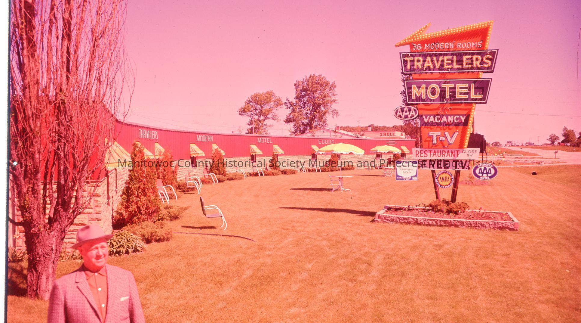 Stock's Travelers Motel, highway 141 south of Manitowoc. Owner is MIlton Stock. Behind motel is Marv Kraemer's Shell Station, 2734 highway 141. Photograph taken on June 17th, 1960.Made/Created