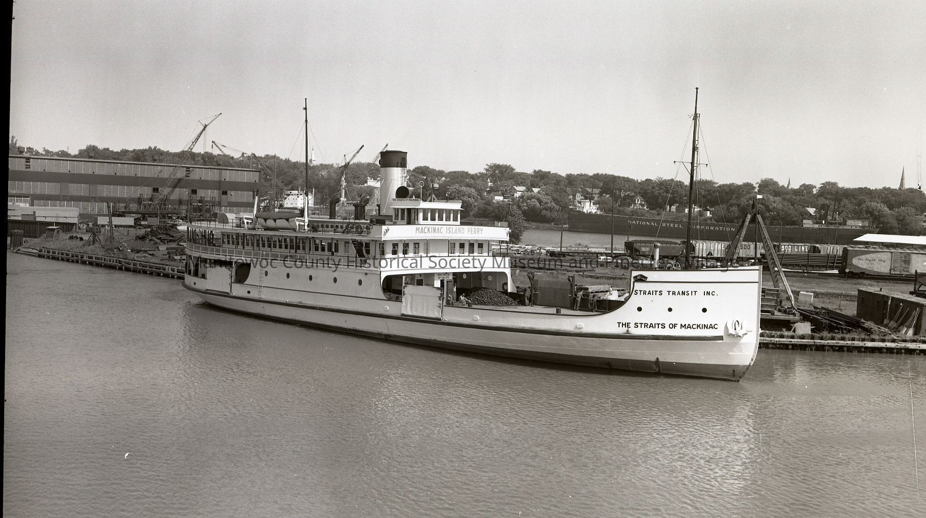 Straits of Mackinac ferry docked at Manitowoc Shipyards. This ferry was used to bring vehicles across the straits of Mackinac until the bridge was built. Photograph taken on September 15th, 1961.Made/Created