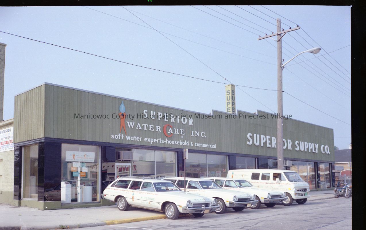 Superior WaterCare Inc., 1101 Franklin Street Manitowoc, with its fleet parked out front. Superior Supply Co. next door; old Erdman Ford Building. Photograph taken in August 1973.Made/Created