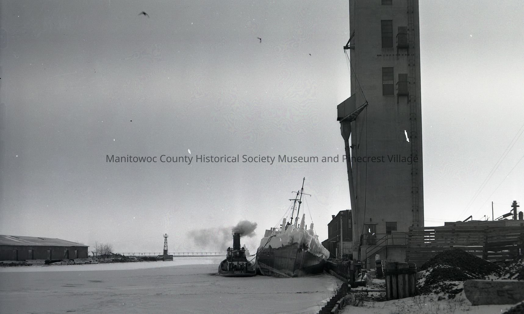 Tanker Detroit heavily iced up docked at Rahr Malting elevator along Quay Street. Tug Green Bay along side with steam line. Photograph taken on January 11th, 1957.Made/Created