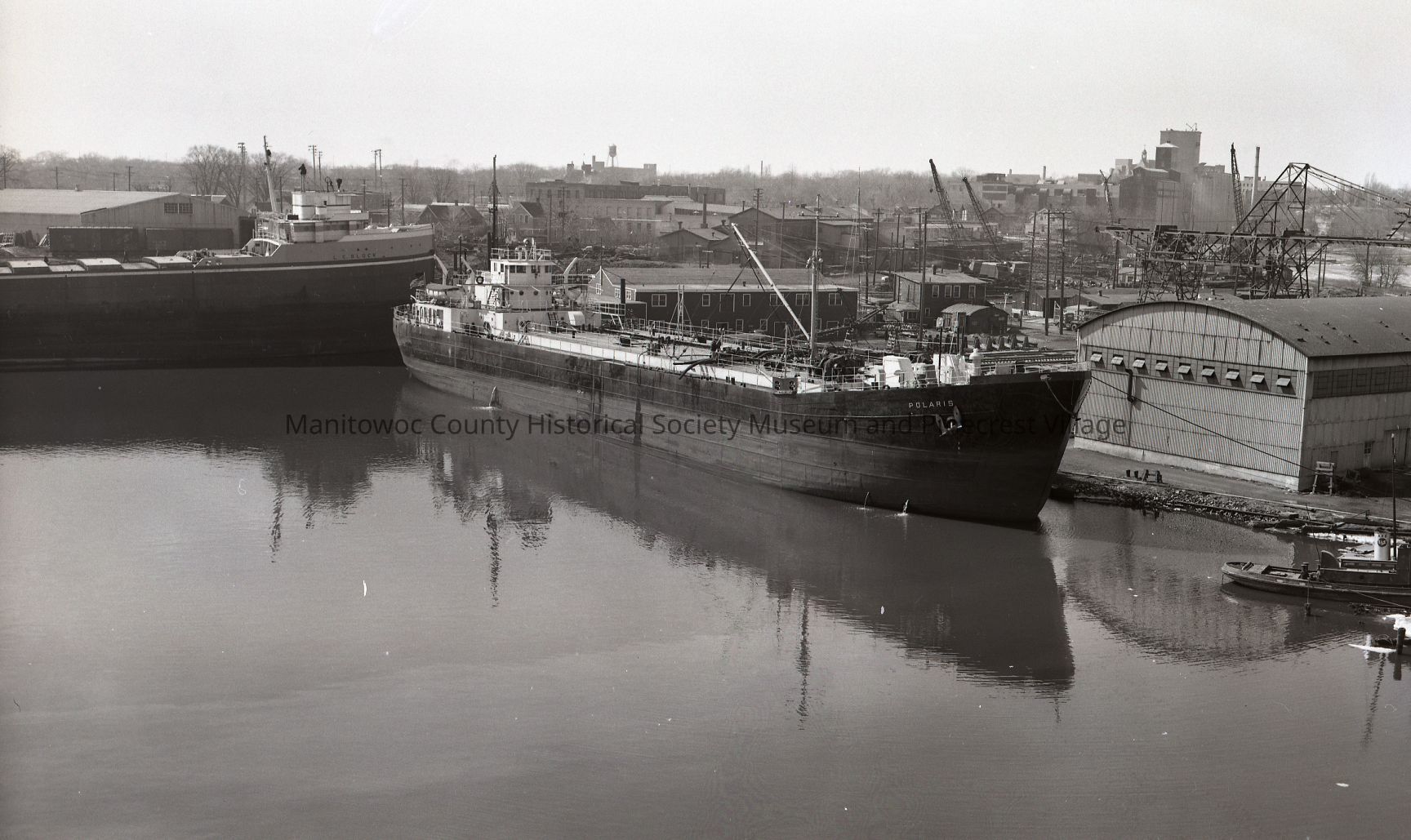 Tanker Polaris docked at Manitowoc Shipbuilding. Behind is W.E. Fitzgerald. In bakground is Aluminum Specialty and Aluminum Goods. Photograph taken on March 9th, 1955.Made/Created