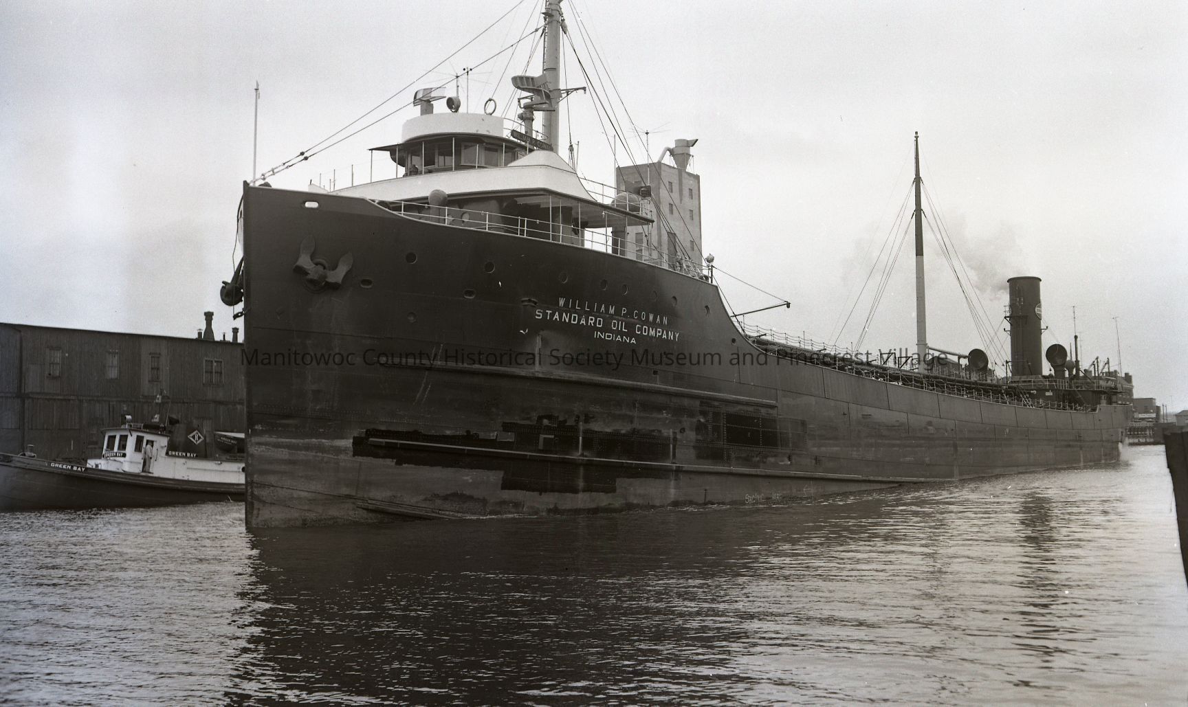 Tanker William P. Cowan going out between bridges in Manitowoc. Photograph taken on April 5th, 1961.