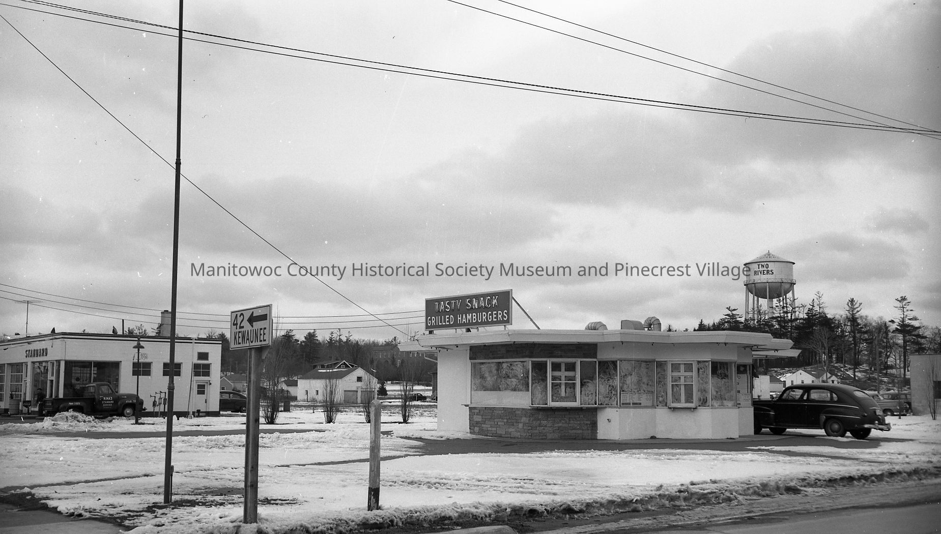 Tasty Snack drive-in, 826 22nd Street Two Rivers. At left is Riha's Standard Station, 2211 Lincoln Ave. Photograph taken in February 1956.Made/Created