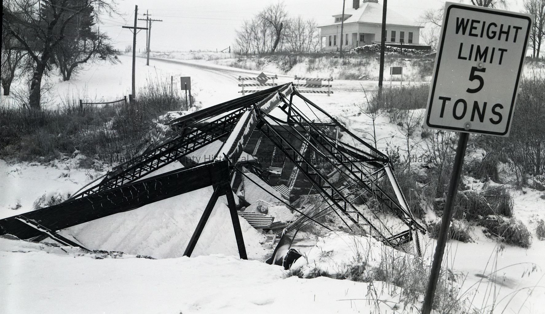 Taus Road bridge collapse over the Branch River. The school at center is Franklin #4 Riverview. Road to right is Decker Road looking north. Photograph taken on December 9th, 1972.