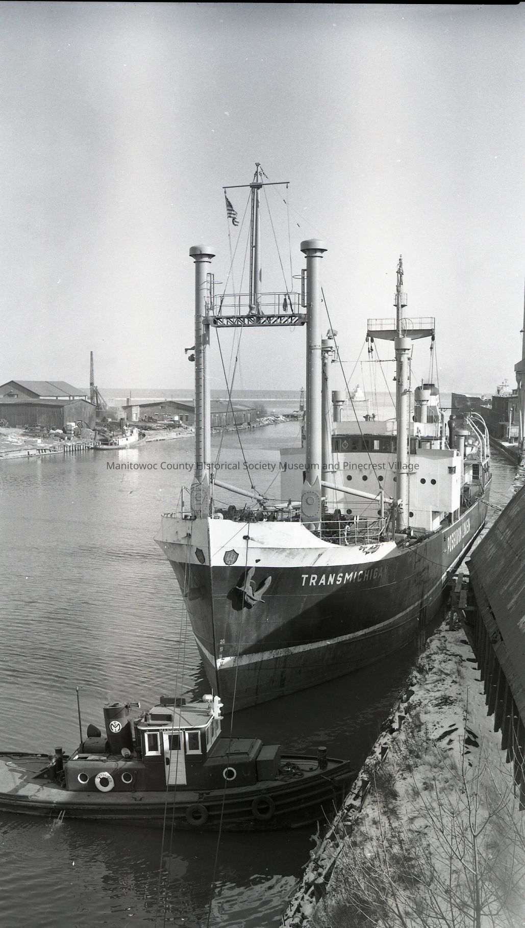 TransMichigan docked at Quay Street. In background is Rahr Malting elevator, Pauly & Pauly Cheese Co. and Pere Marquette at the lakefront slip. Circa 1951.Made/Created