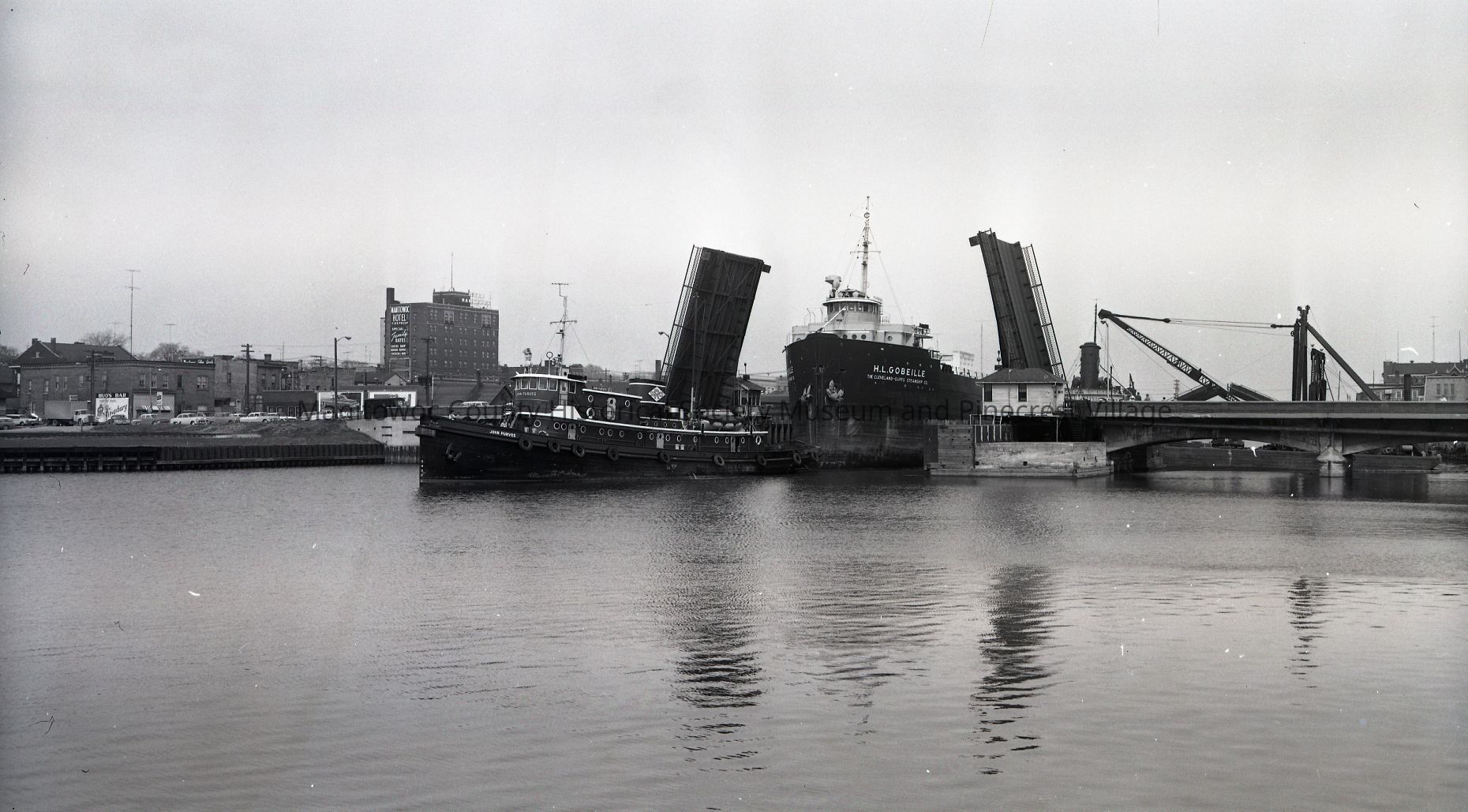 Tug John Purves towing H.L. Gobeille through 10th Street bridge going up river. Photograph taken on May 4th, 1961.Made/Created