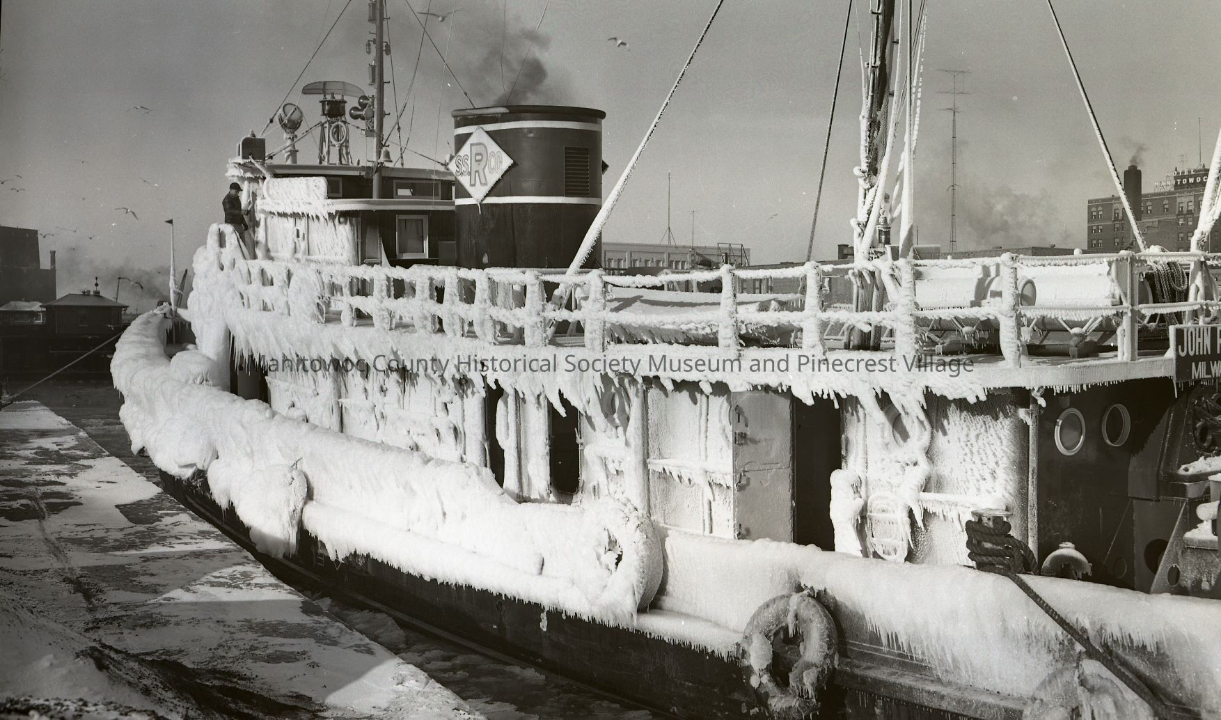 Tug John Roen V docked along Quay Street. Men are clearing ice off after cold outing on Lake Michigan. Circa 1950.Made/Created