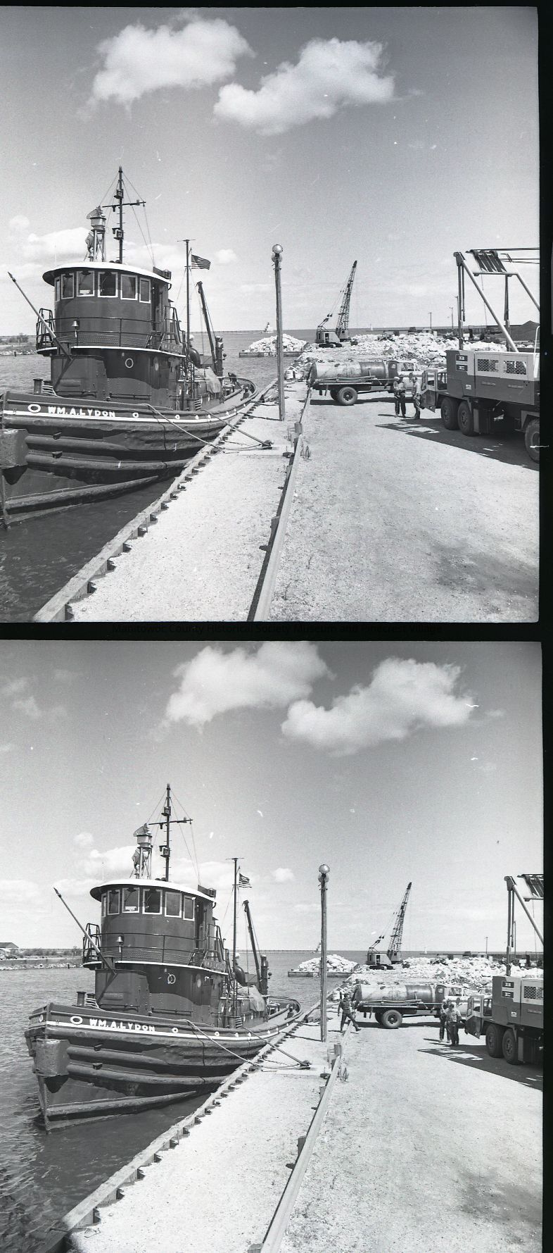 Tug William A. Lydon docked at the lakefront at Quay Street. The stone barge behind it is what it was towing.