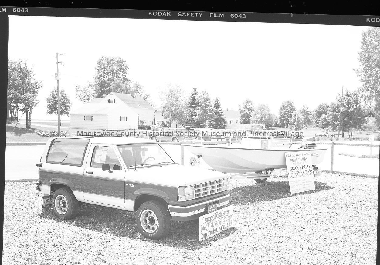 Fishing boat grand prize for the Two Rivers Kiwanis fishing derby at Neshoto Park. Photograph taken in August 1989.Made/Created
