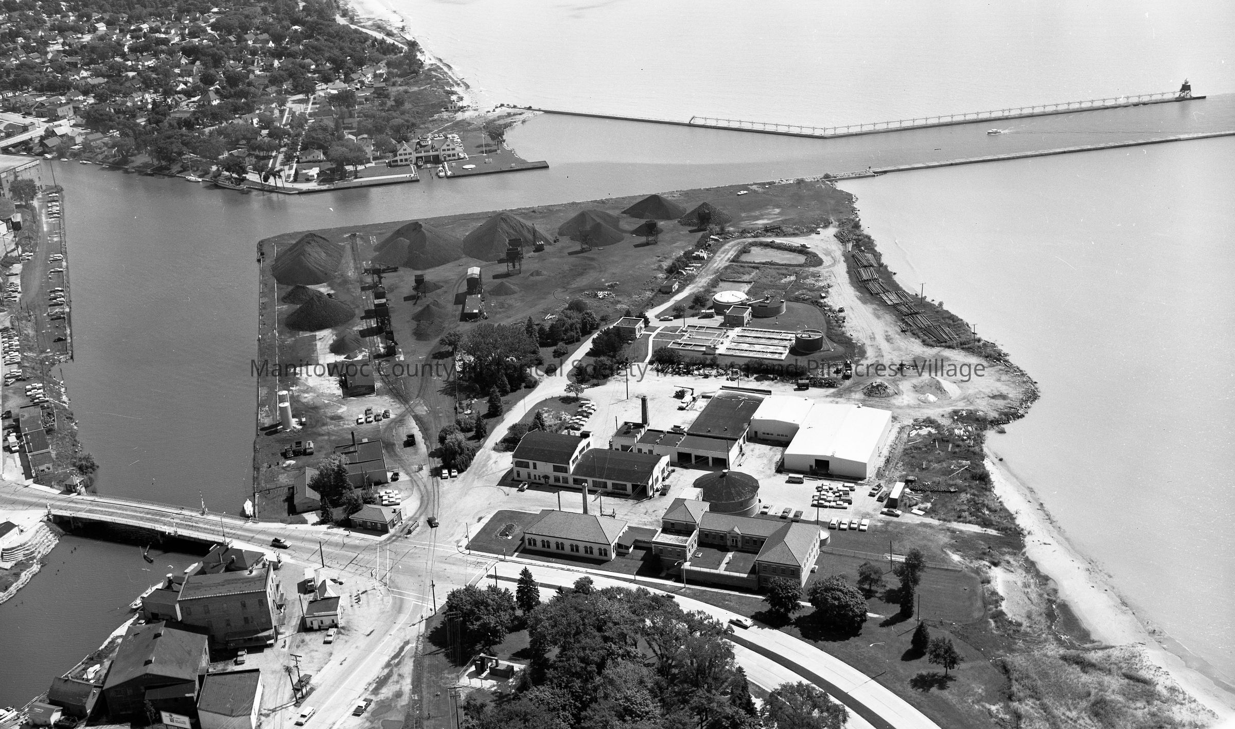 Aerial view of Two Rivers waterworks & sewage treatment plant and Washington Street bridge. Photograph taken in July 1969.Made/Created
