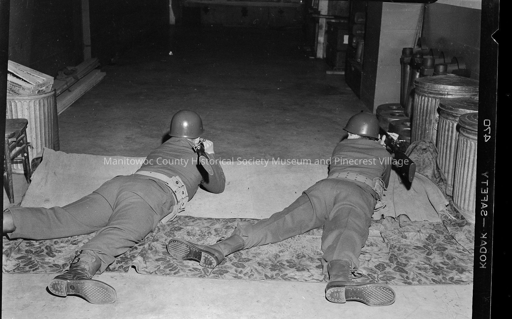 U.S. Army National Guard - Company E, 127th Infantry, 32nd Division troops at firing range downstairs at Manitowoc Armory, 930 North 18th Street. Photograph taken on April 15th, 1951.Made/Created