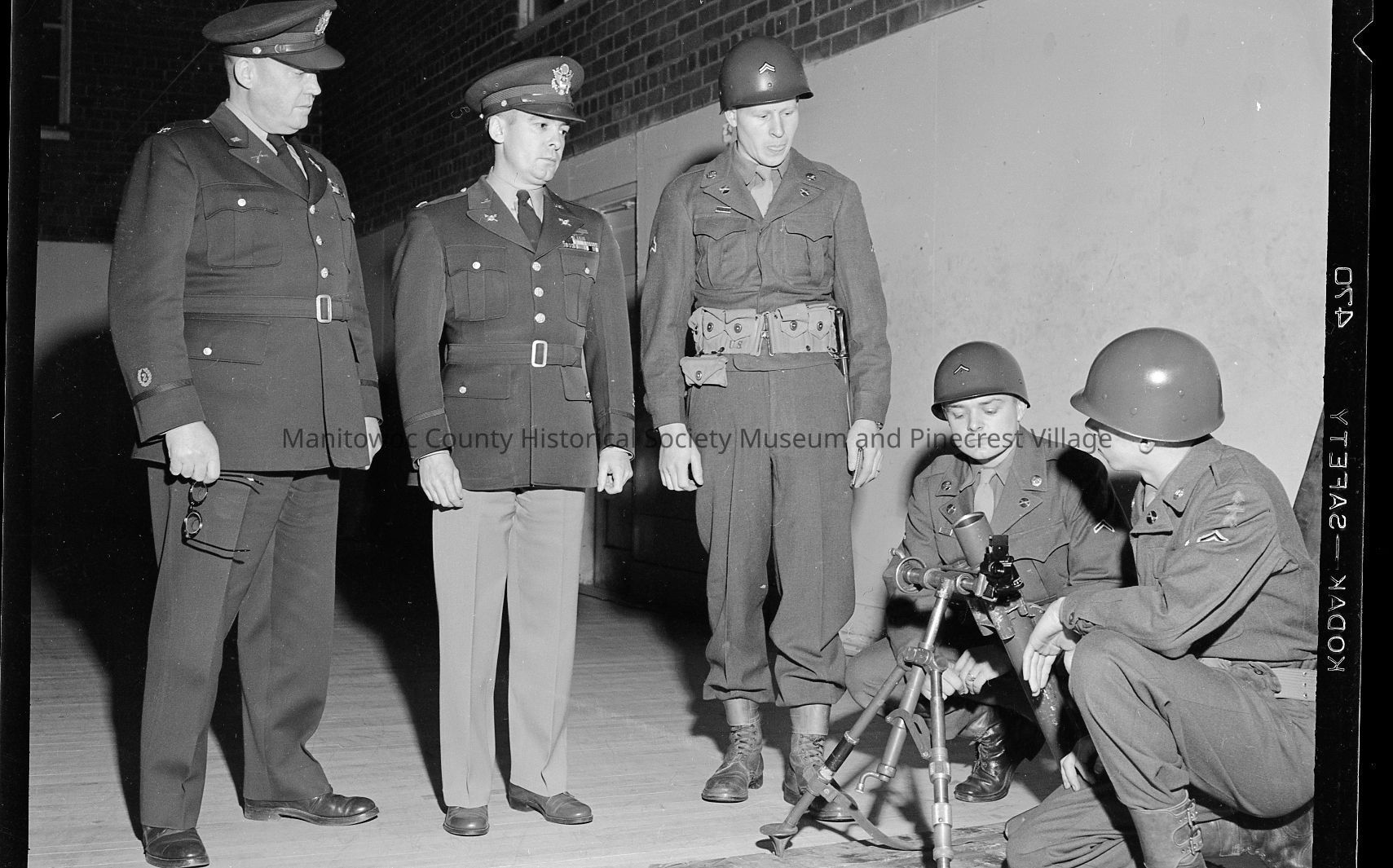 U.S. Army National Guard - Company E, 127th Infantry, 32nd Division troops with mortar being inspected at Manitowoc Armory, 930 North 18th Street. Photograph taken on April 15th, 1951.Made/Created