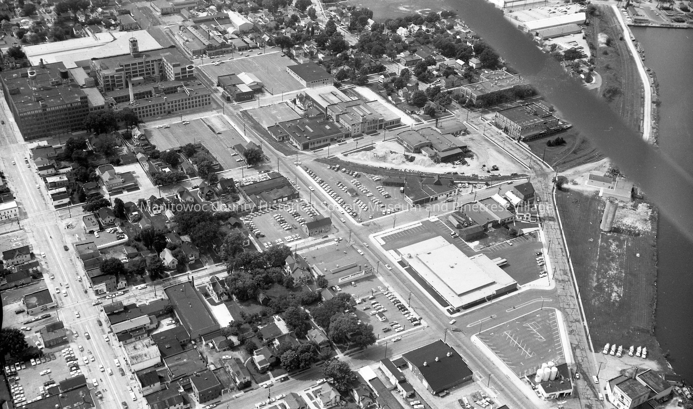 Aerial: U.S. Post Office, 1202 Franklin Street Manitowoc. Across street is Lauson Chevrolet, 1215 Franklin; upper left is Mirro Aluminum Plant #2 and at bottom right is Triangle Oil Company, 1102 Franklin Street.