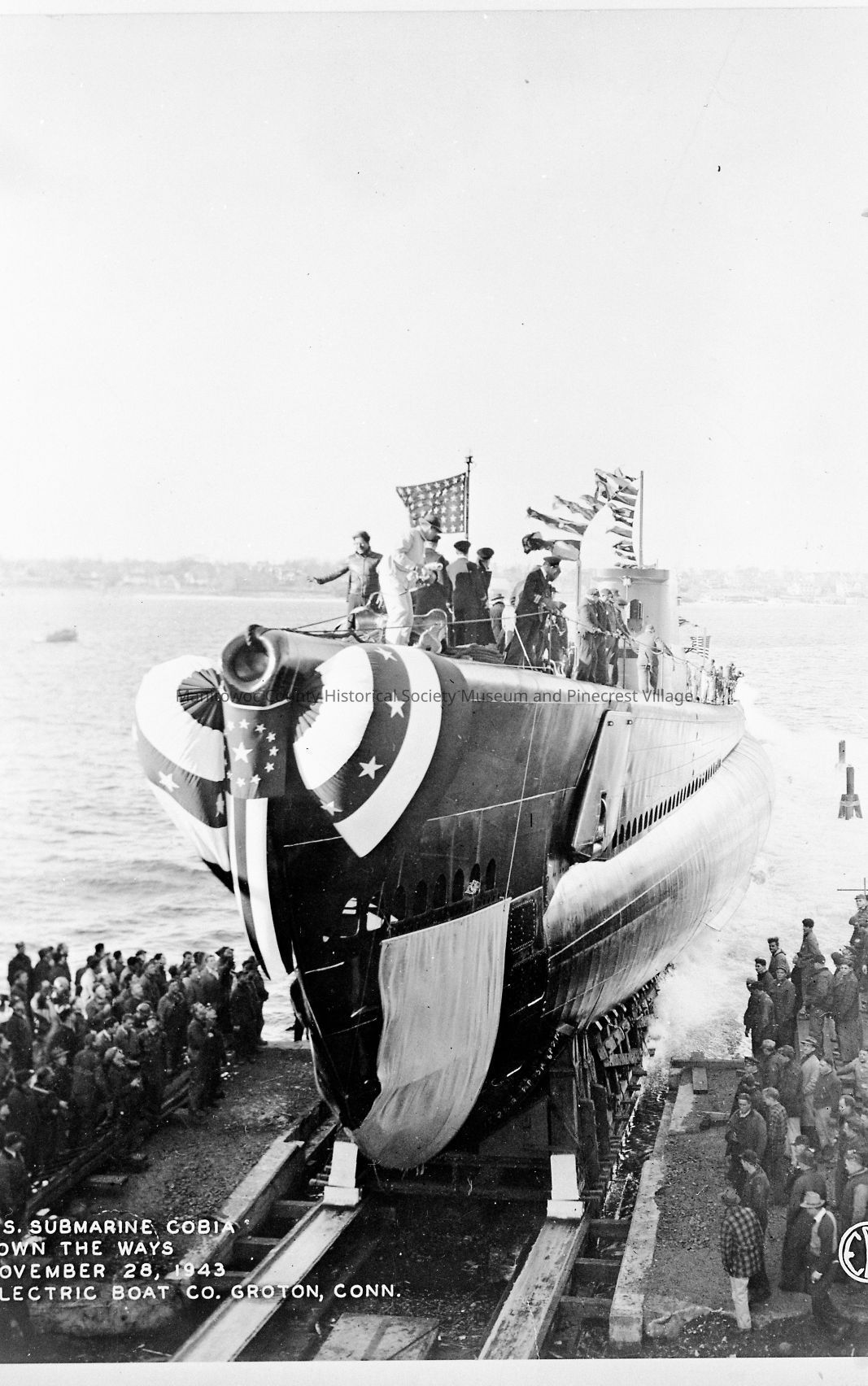 USS Cobia launching at Groton, Connecticut. Photograph taken on November 28th, 1943.