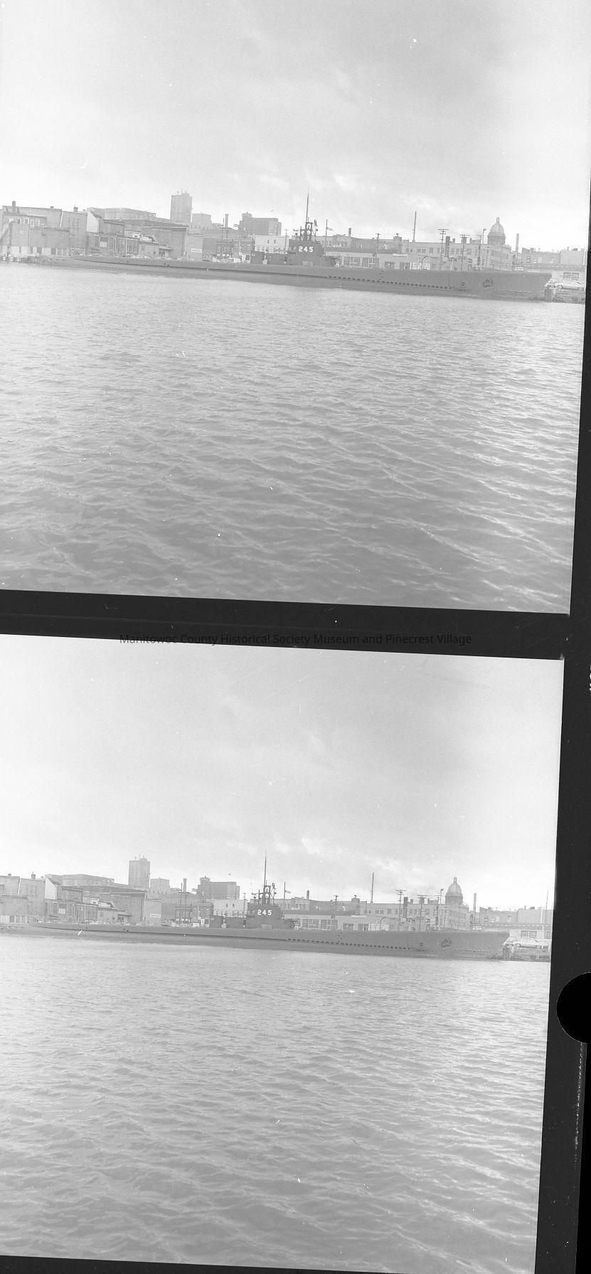 USS Cobia looking from north side of river at original berth along 800 Block Quay Street Manitowoc. Circa 1971.