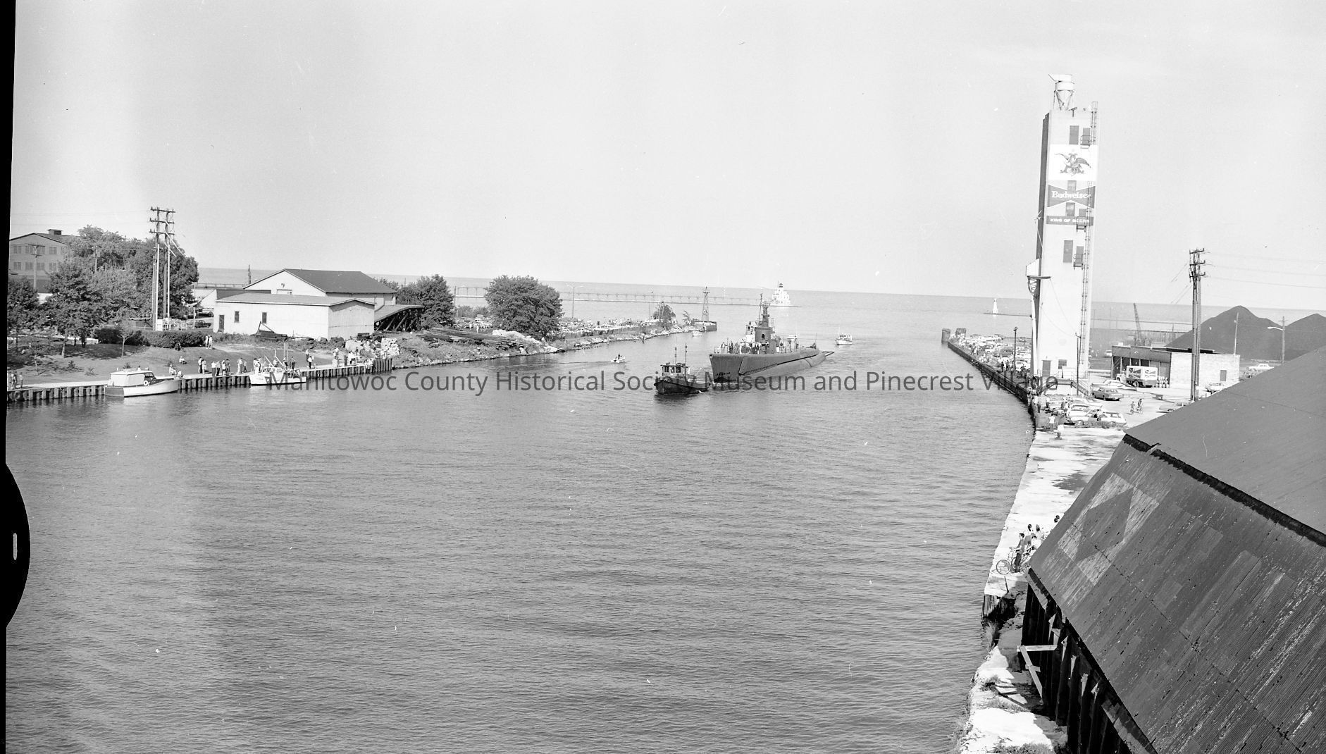 USS Cobia coming into Manitowoc to become a museum ship. At lower right is Spindler Coal Shed and ahead is the Budweiser elevator along Quay Street. Photograph taken on August 18th, 1970.Made/Created