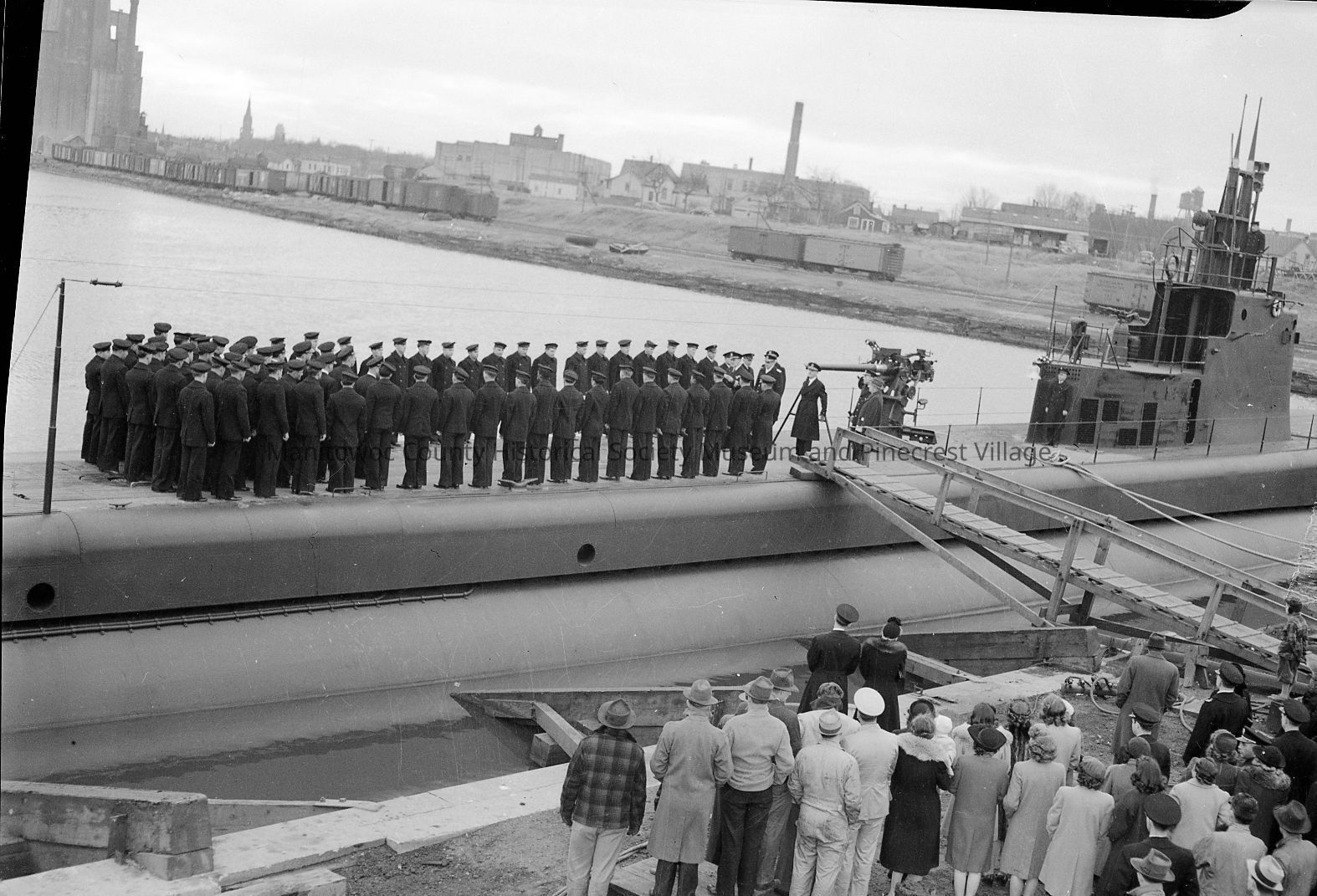 Commissioning of the USS Icefish near South 16th Street entrance. At upper left corner is Elevator B. Photograph taken in 1943.Made/Created