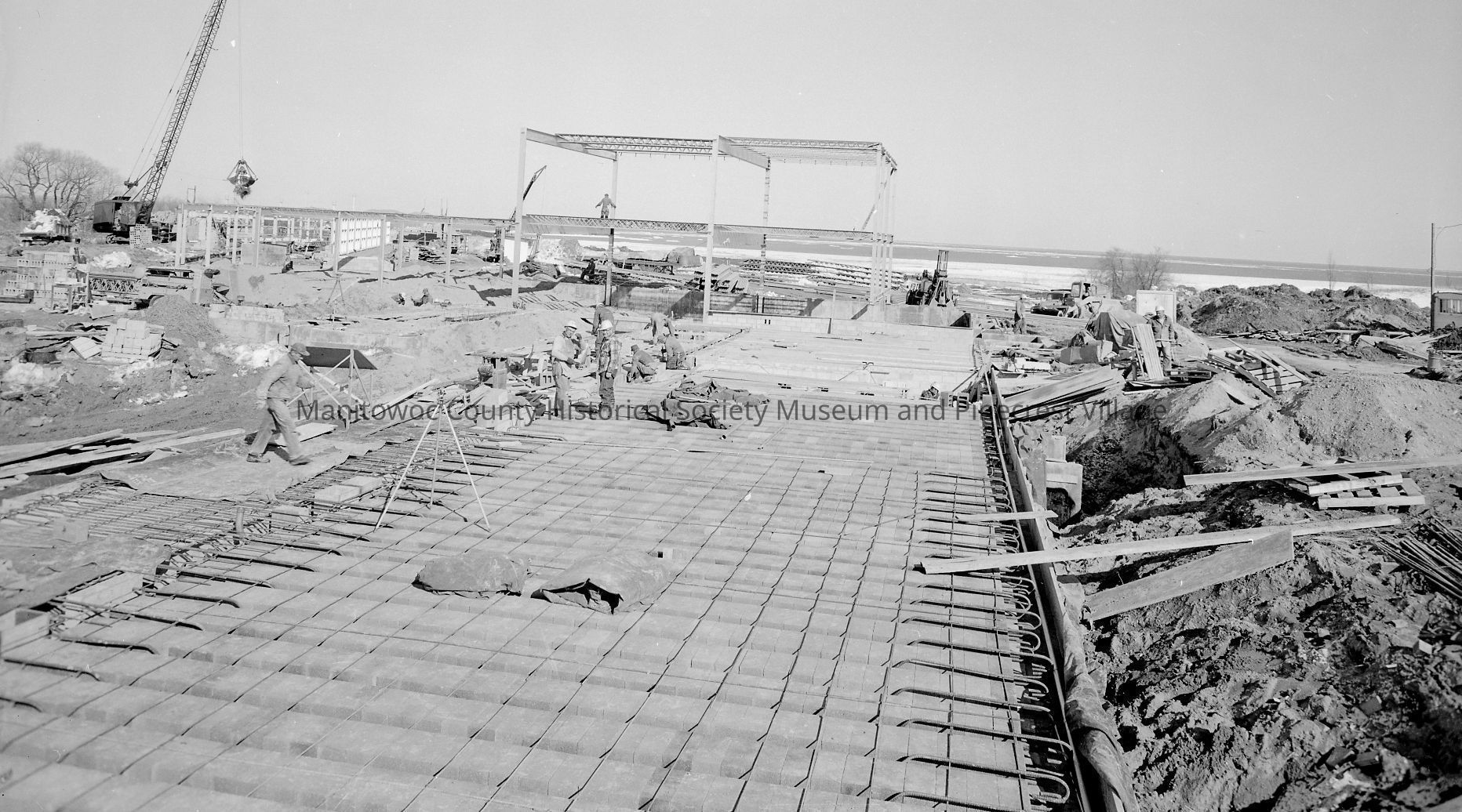 UW-Manitowoc, 705 Viebahn Street, getting ready for cement on main floor, looking east. Photograph taken on March 16th, 1962.Made/Created