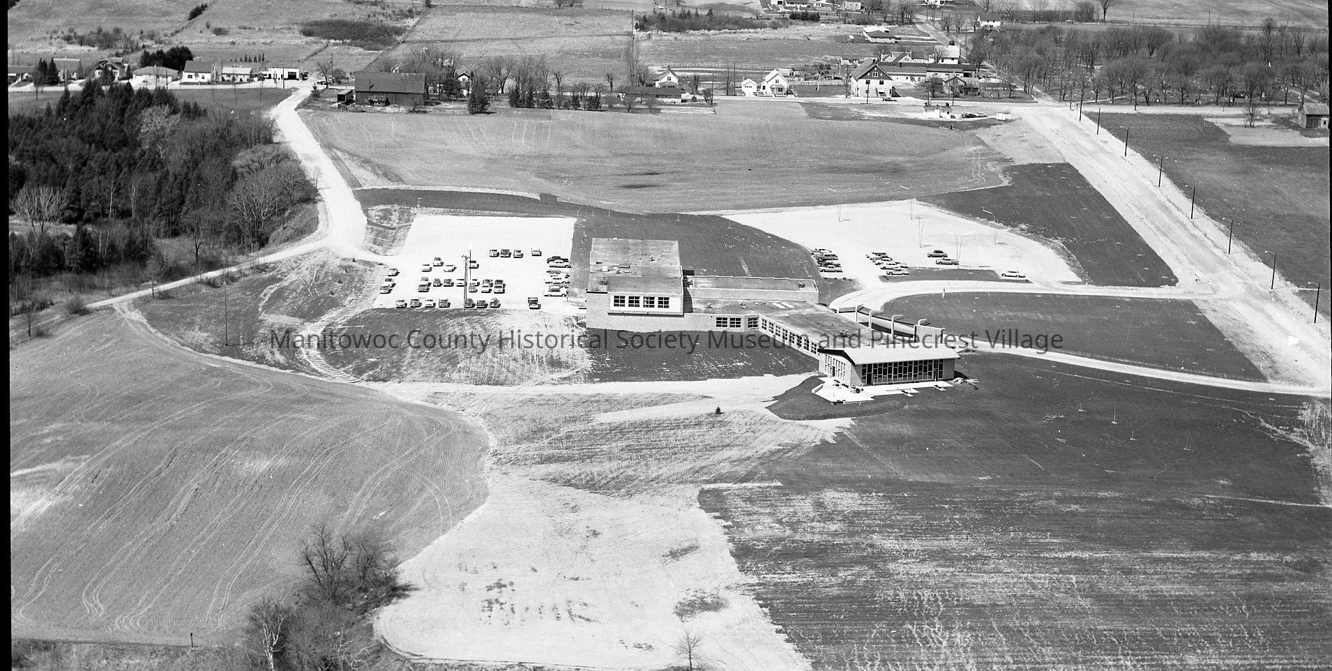 Aerial view of UW-Manitowoc campus looking west. At right is Viebahn, at left is Silver Creek Park and at upper center is South 10th street. At corner of South 10th & Viebahn street is Phil's Bar-B-Q, 2708 South 10th and across is Blue Waters Inn, 2706 South 10th street. On the corner is Calvary Cemetery.