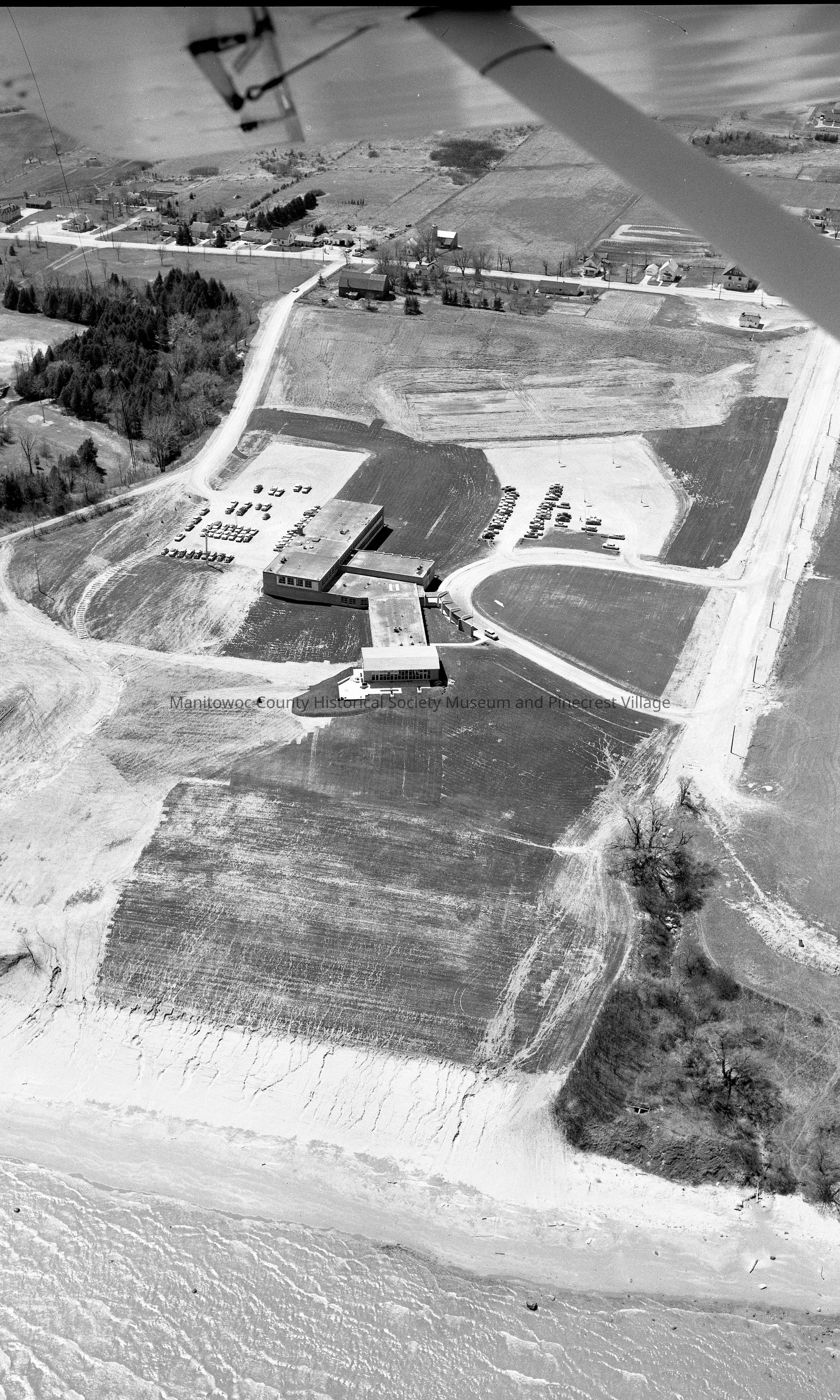 Aerial view of the UW-Manitowoc campus, 705 Viebahn Street Manitowoc. At top by wing strut is Phil's Drive In, 2708 South 10th Street. Photograph taken in August 1963.Made/Created