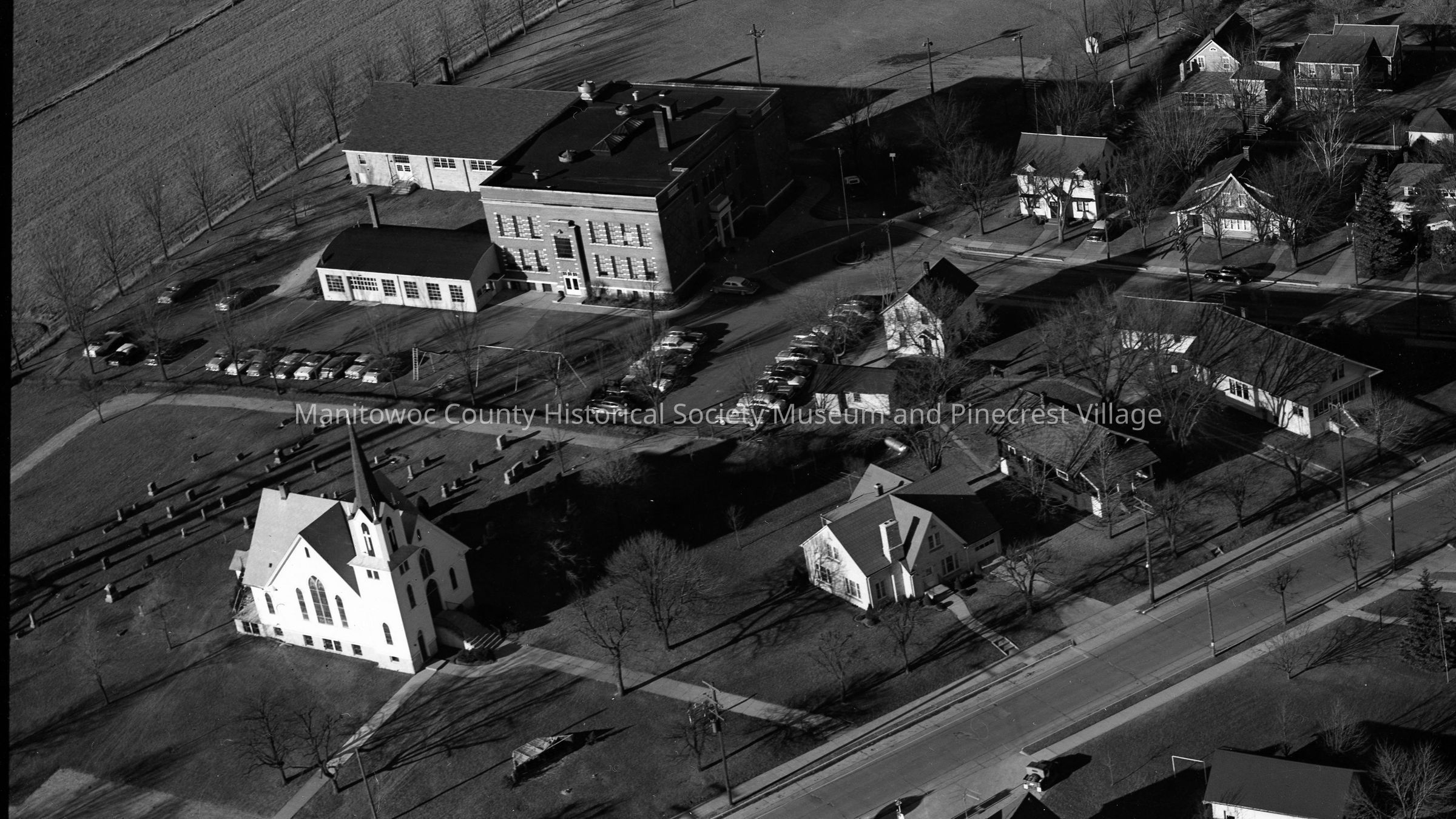 Aerial view of Valders High School and original Our Savior Lutheran Church. Hwy 151 is road near bottom. Photograph taken on December 17th, 1967.Made/Created