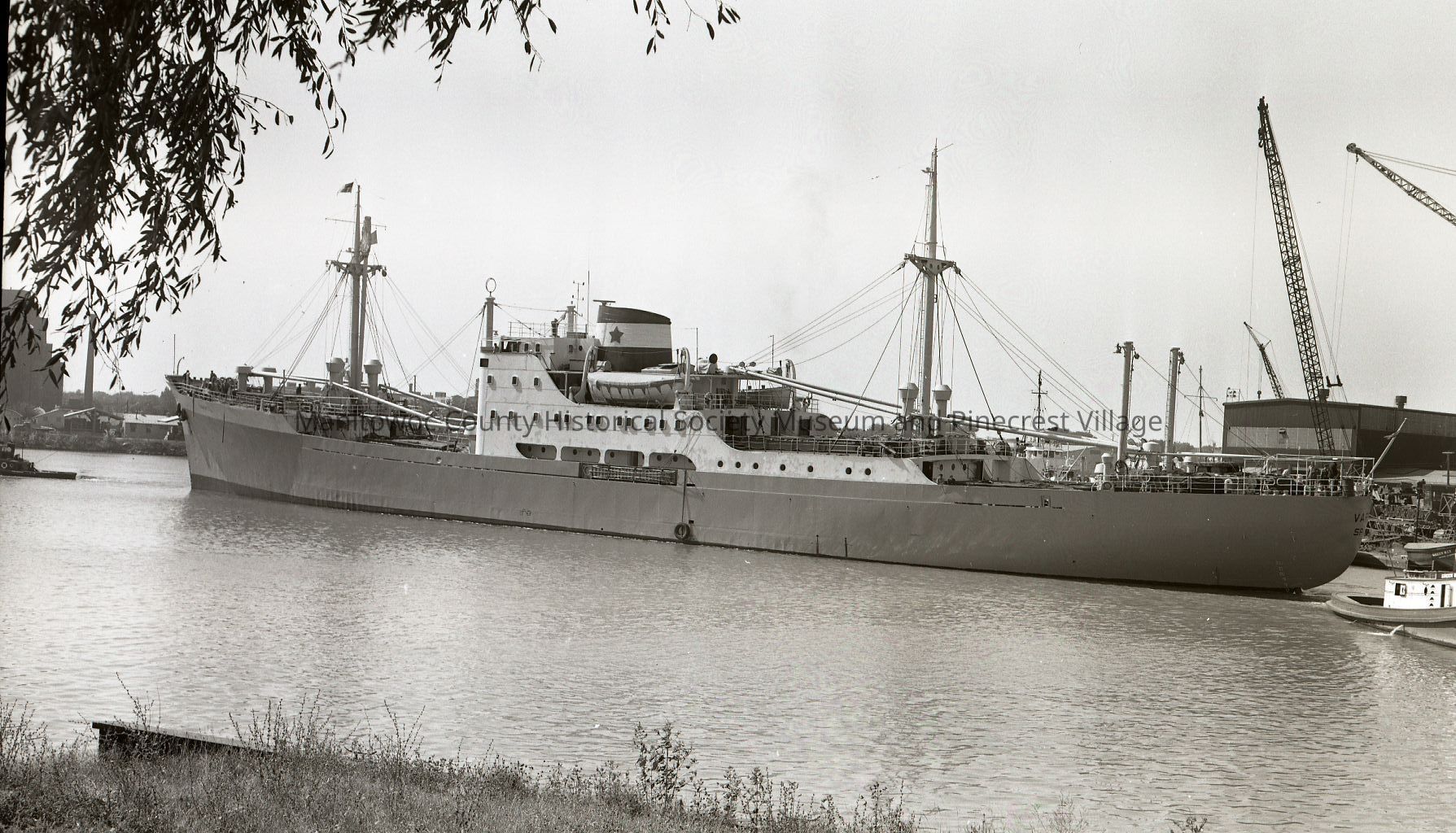 Foreign ship Vares at Manitowoc Shipbuilding being towed by tug Green Bay. She was there to load truck cranes. Photograph taken on Septemeber 15th, 1961.Made/Created