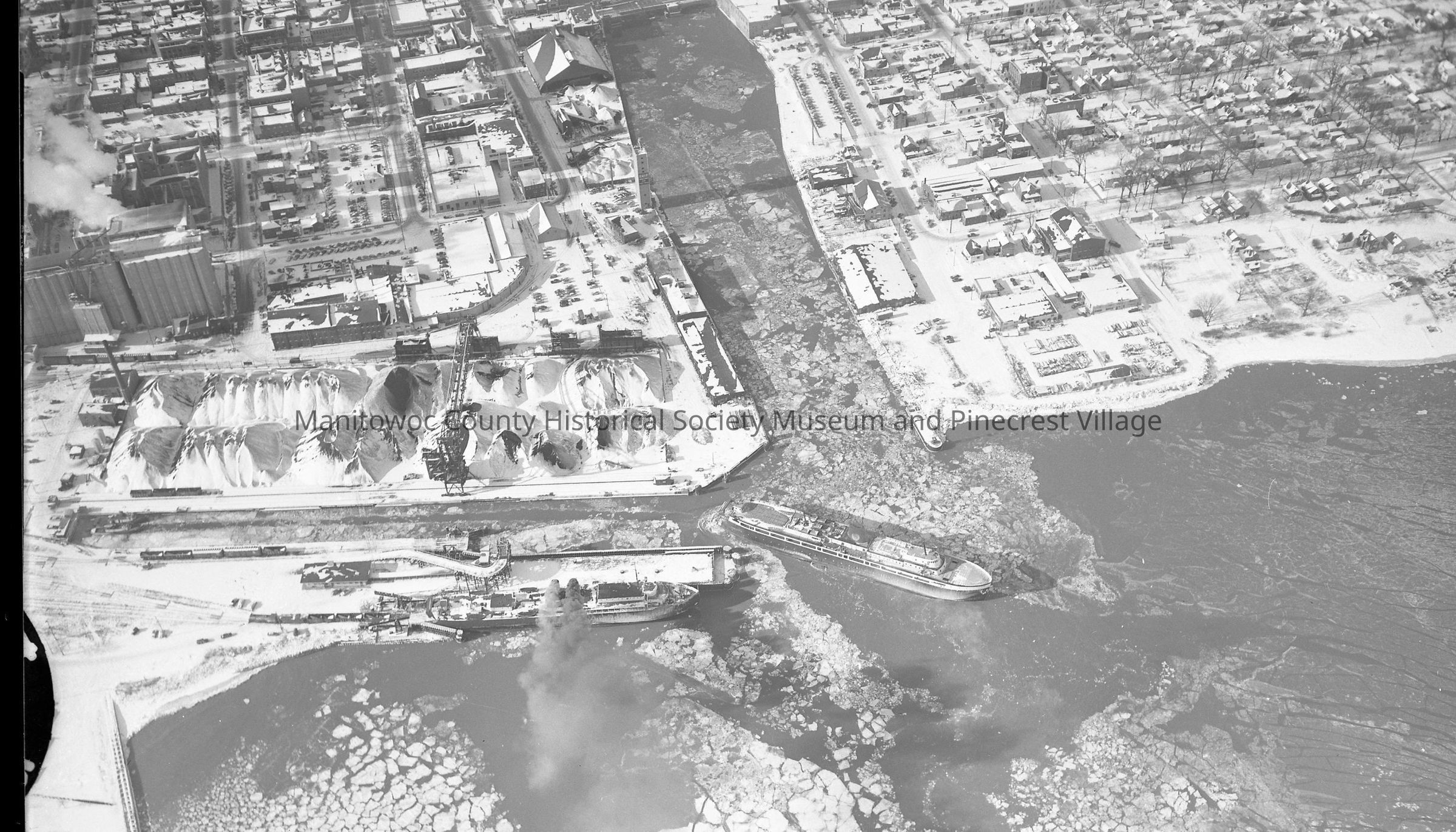 Aerial view of the Manitowoc harbor entrance on cold icy day. City of Midland carferry backing into slip and an Ann Arbor carferry is docked at the lakefront. Photograph taken on December 12th, 1956.Made/Created