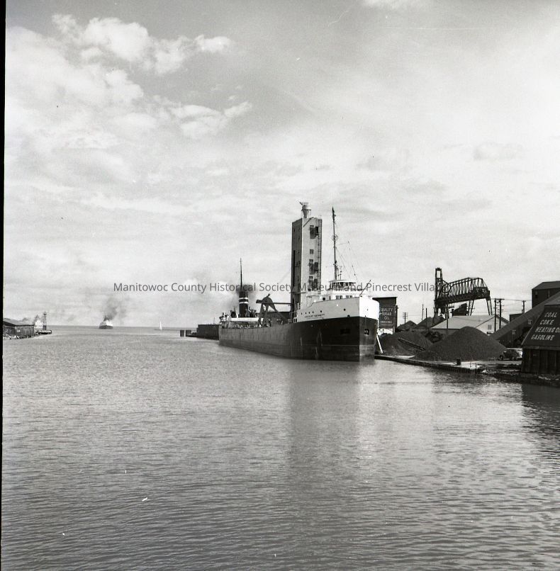 Viscount Bennett being unloaded at the Rahr Malting elevator with the John Kling coming in at the pier head. Photograph taken in 1952.Made/Created