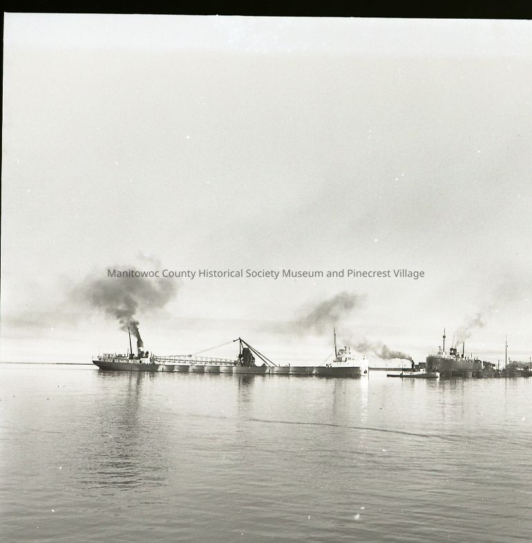 W.E. Fitzgerald being towed past lakefrone carferry slip by tug Green Bay. She is loaded and going up river. Photograph taken in 1952.Made/Created
