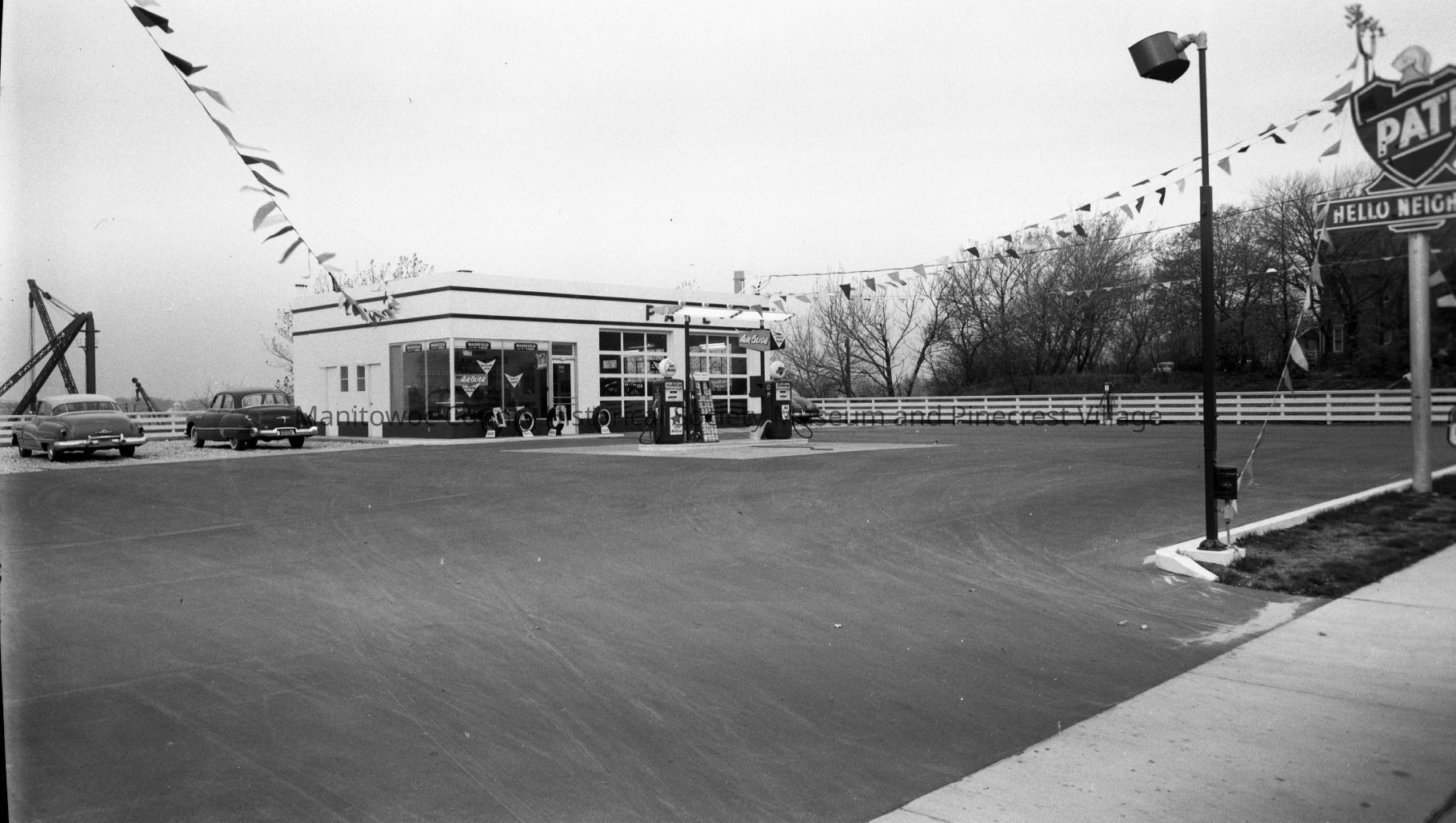 Wagner Pate Service Station, 612 North Water Street Manitowoc. At left is stiff-leg crane down at Manitowoc Shipbuilding. Photograph taken in 1957.Made/Created