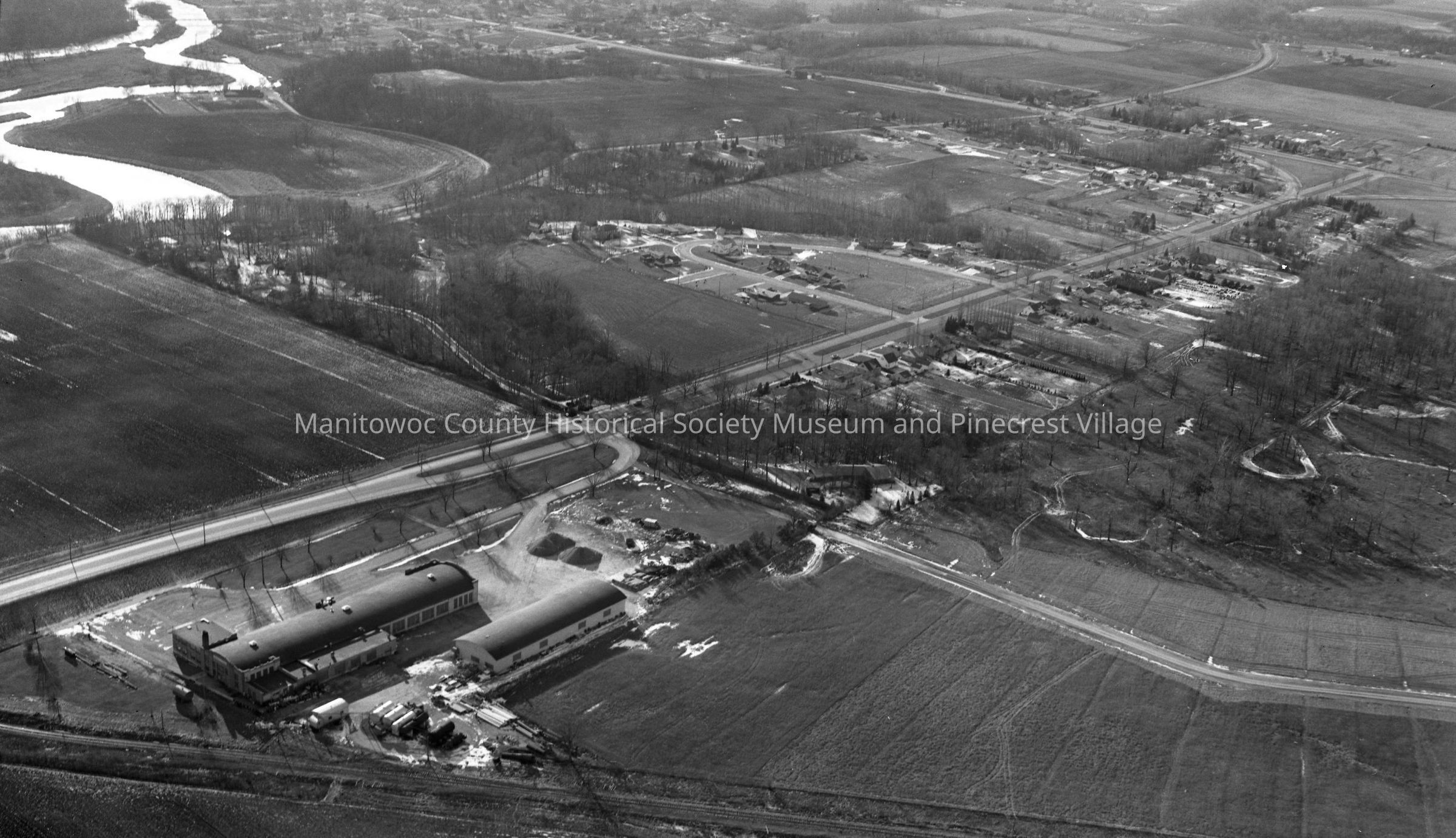 Aerial of Waldo Blvd. looking southwest. At lower left is Manitowoc Highway Shops. Rail line by wheel is old C&NW line to Reedsville and beyond (now gone). Photograph taken on December 17th, 1960.Made/Created