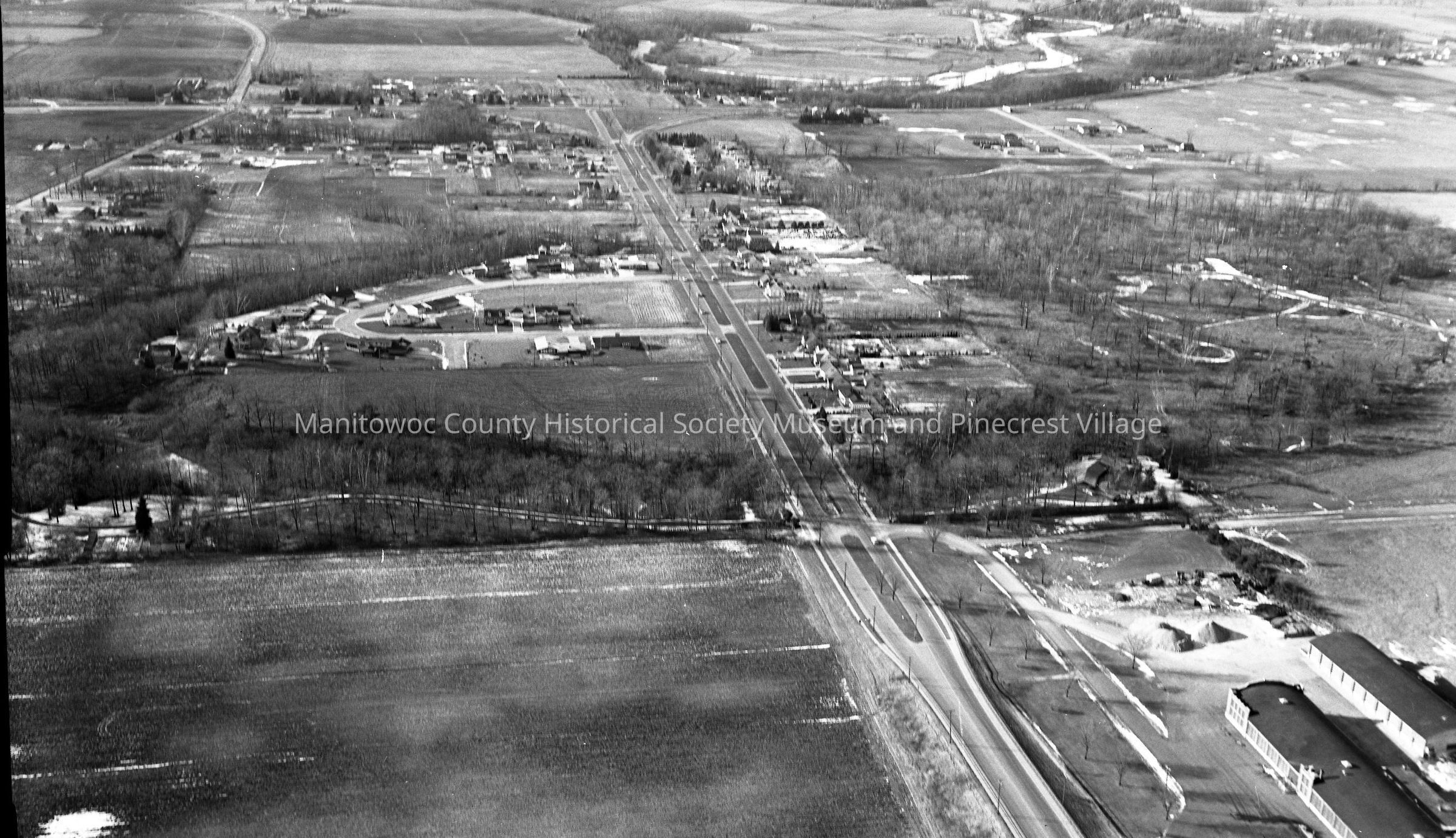 Aerial of Waldo Blvd. looking west from Manitowoc County Highway Shops at bottom right. Photograph taken on December 17th, 1960.Made/Created