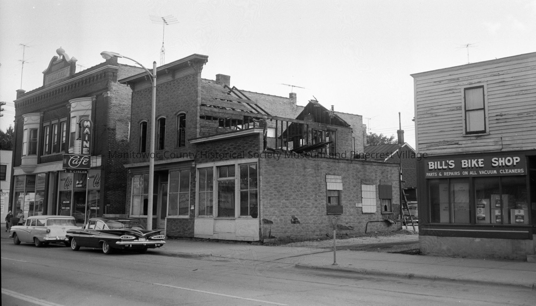 Washington Street 1000 block Manitowoc. Zannacker's Cleaners, 1001; Maine Cafe, 1003-1005; Bill's Bike Shop. Buildings starting to be removed for new Firestone Tire Store. Photograph taken on September 27th, 1960.Made/Created