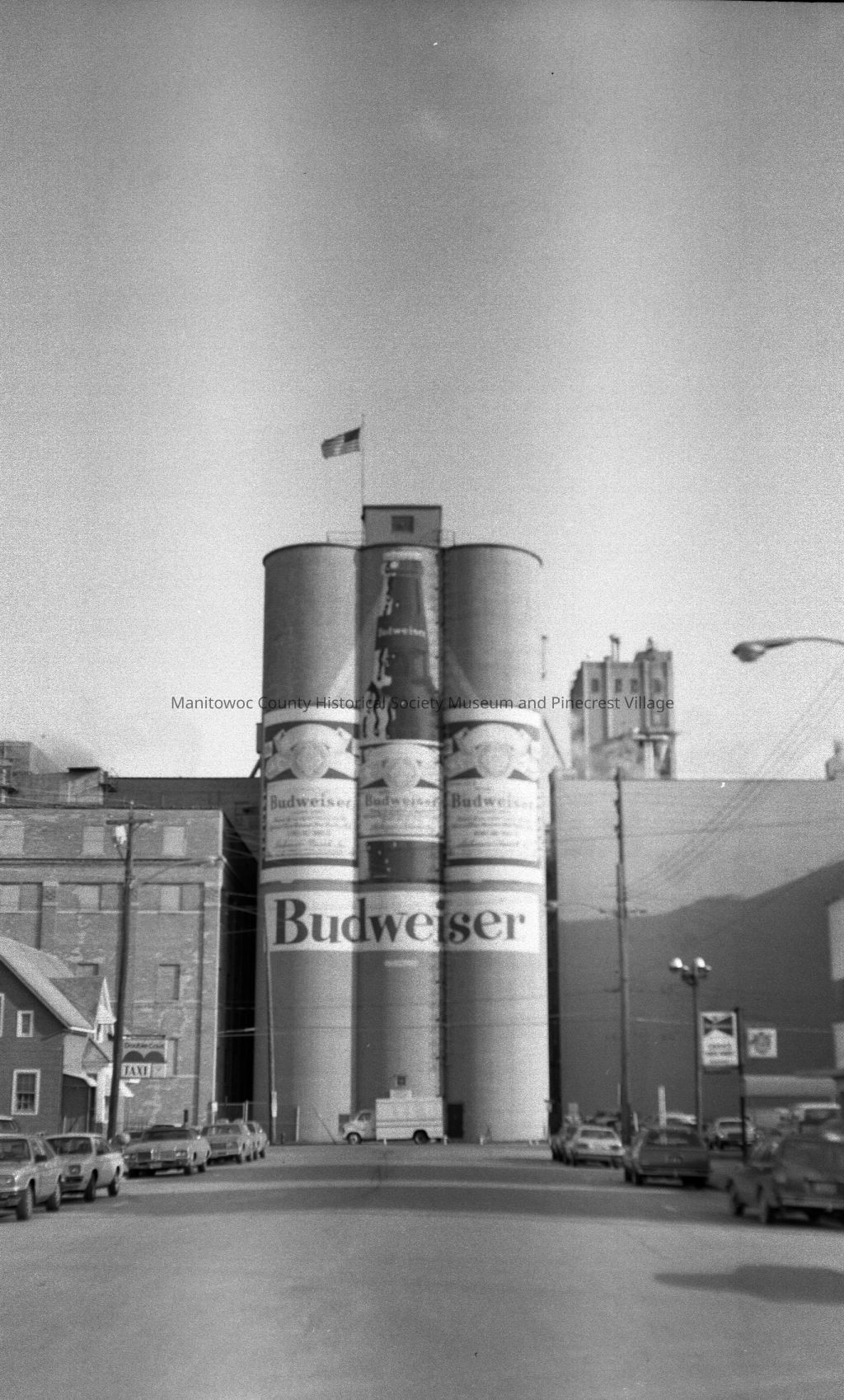 Washington Street 700 block Manitowoc. At center is Anheuser-Busch malting; at left is Checker Cab Company, 704 and right is Doctors Building, 709 Washington Street. Circa 1970.Made/Created