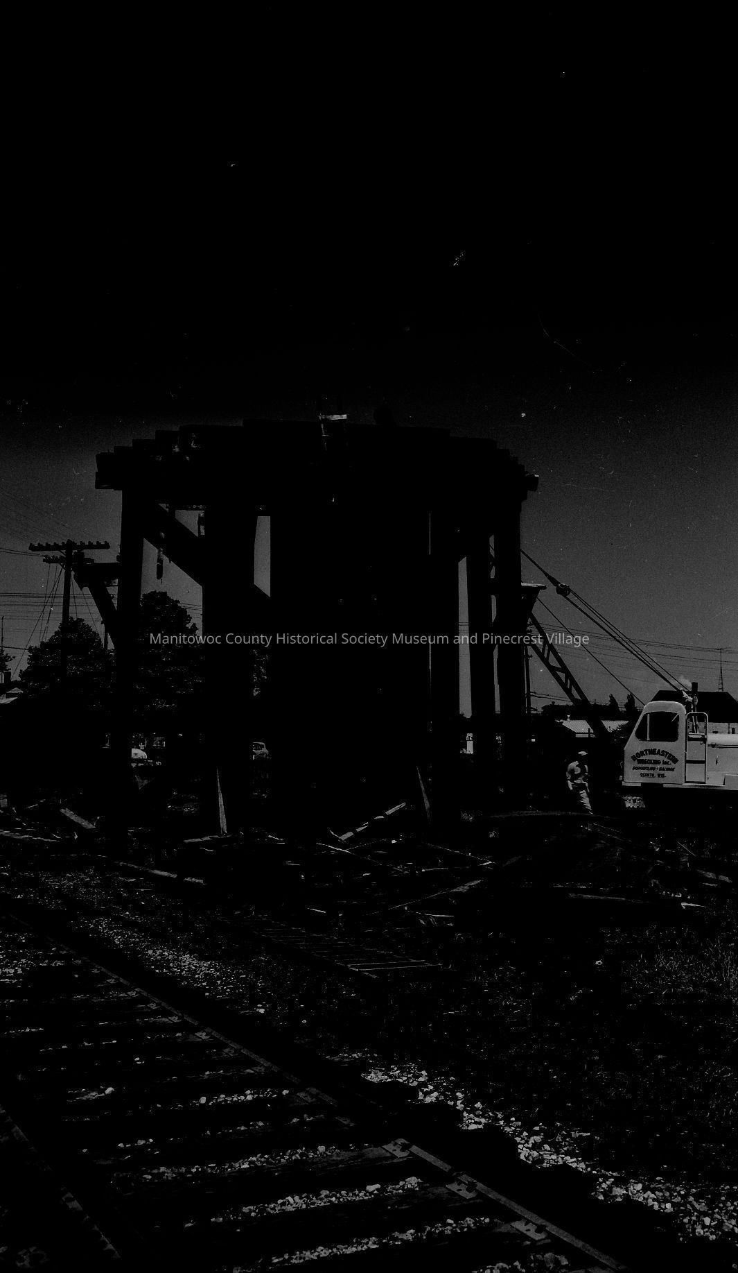 Water tower, C&NW RR being torn down, looking west. Two buildings at left are the hand car building and the section house. Water tower was between Calumet Ave. and Custer Street Manitowoc. Circa 1960.Made/Created