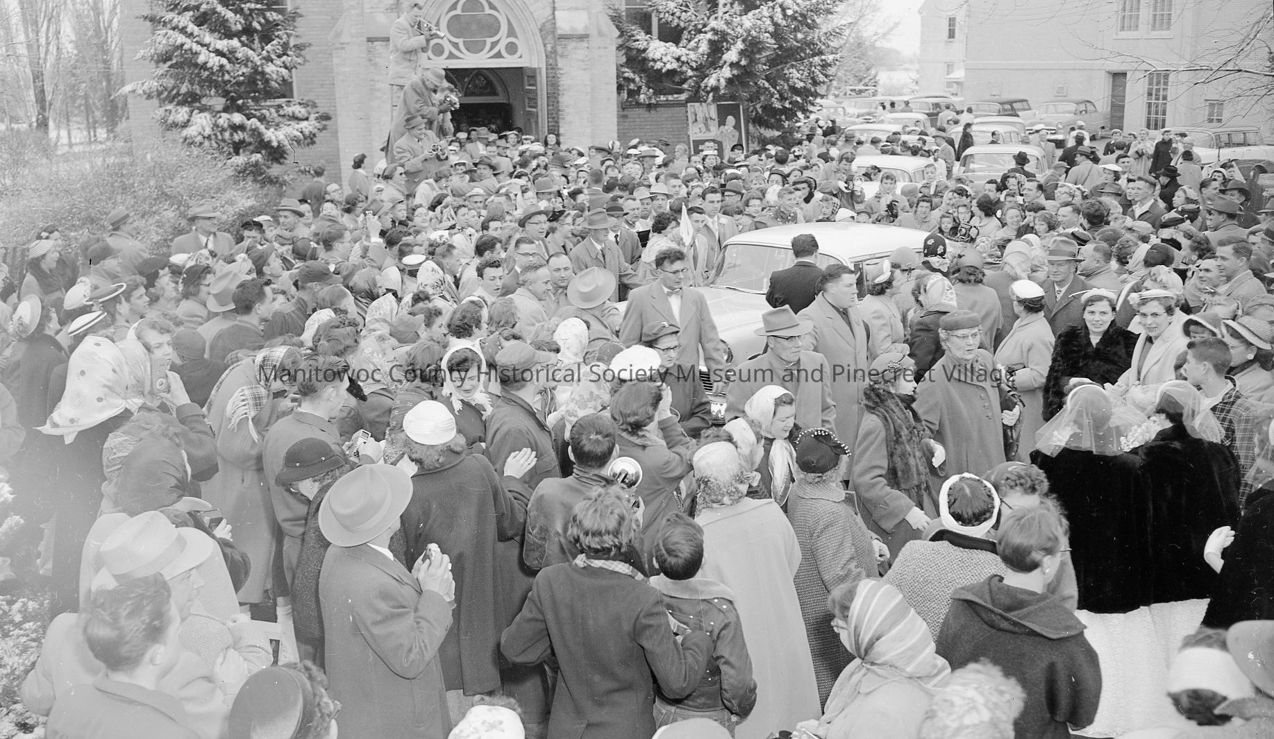 Wedding of Julius La Rosa to Rosemary Meyer; crowd outside after the wedding. Photograph taken on April 7th, 1956.