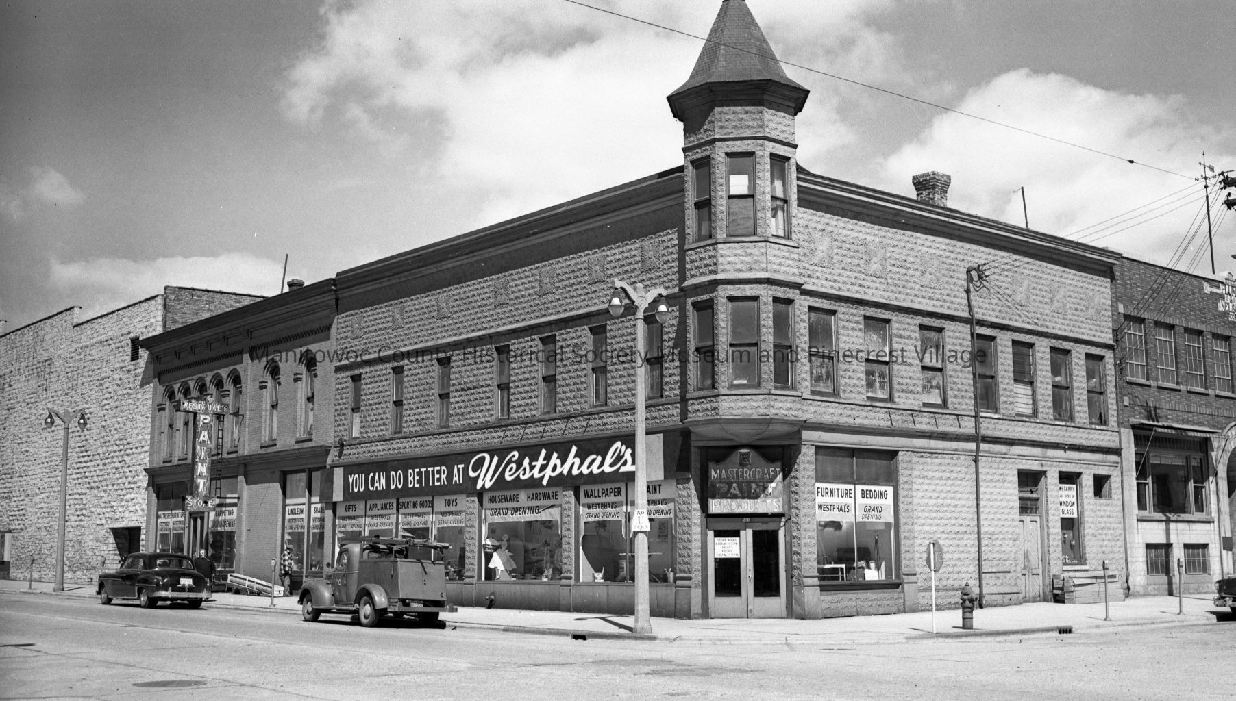 Westphal Hardware, 301 North 8th Street Manitowoc. At left is Strand Theater, 315 North 8th and at right is Plumb & Nelson Wholesale Foods, 716 Buffalo Street. Photograph taken on April 17th, 1953.Made/Created